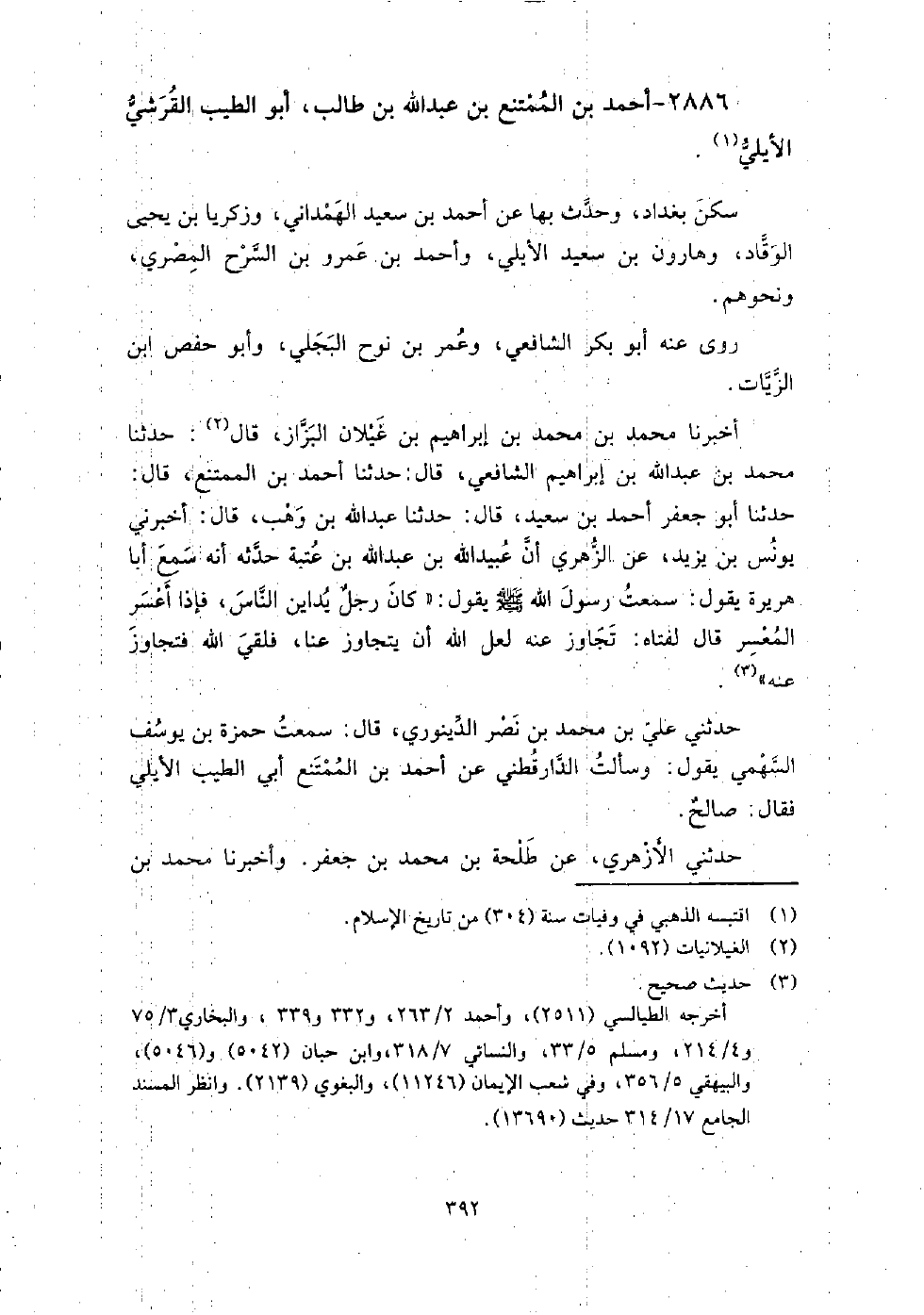 2886 - أَحْمَد بْن الممتنع بْن عَبْد اللَّهِ بْن طَالِب أَبُو الطيب القرشي الأيلي سكن بغداد، وحدث بِهَا عَن أَحْمَد بْن سَعِيد الهمداني، وزكريا بْن يَحْيَى الوقاد، وهارون بْن سَعِيد الأيلي، وأَحْمَد بْن عمرو بْن السرح المصري، ونحوهم.