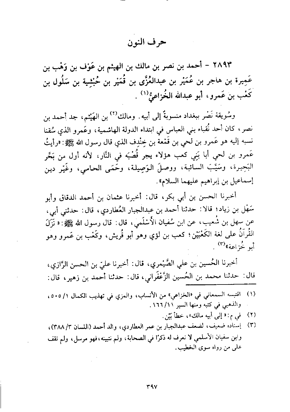 2893 - أَحْمَد بْن نصر بْن مالك بْن الهيثم بْن عوف بْن وهب بْن عميرة بْن هاجر بْن عمير بْن عَبْد العزى بْن قمير بْن حبشية بْن سلول بْن كعب بْن عُمَر أَبُو عَبْد اللَّهِ الخزاعي وسويقة نصر ببغداد منسوبة إِلَى أَبِيهِ، ومالك بْن الهيثم، جد أَحْمَد بْن نصر، كَانَ أحد نقباء بني الْعَبَّاس فِي ابتداء الدولة الهاشمية، وعمرو الَّذِي سقنا نسبه إليه هو عمرو بْن لحي بْن قمعة بْن خندف الَّذِي قَالَ رَسُولُ اللَّه صَلَّى اللَّهُ عَلَيْهِ وَسَلَّمَ: " رأيت عمرو بْن لحي أبا بني كعب هؤلاء يجر قصبه فِي النار، لأنه أول من بحر البحيرة، وسيب السائبة، ووصل الوصيلة، وحمى الحامي، وغير دين إسماعيل بْن إِبْرَاهِيم عليهما السلام ".