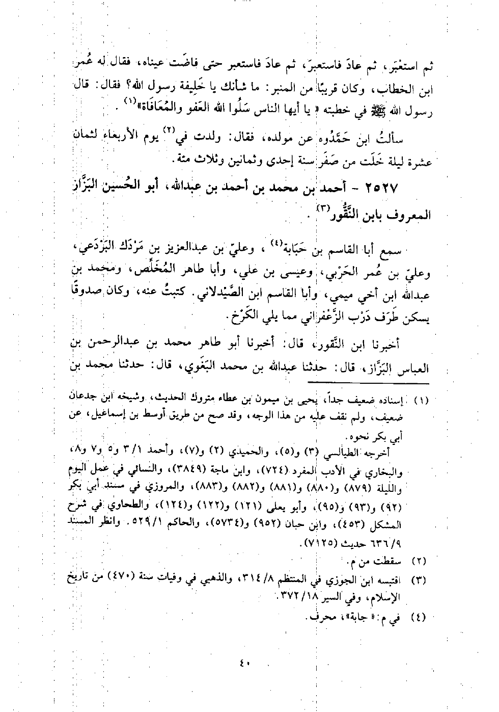 2527 - أَحْمَد بْن مُحَمَّد بْن أَحْمَد بْن عَبْد اللَّه أَبُو الحسين البزاز المعروف بابن النقور سمع أبا القاسم بْن حبابة، وعلى بْن عَبْد العزيز بْن مردك البردعي، وعلى بْن عمر الحربي، وعيسى بْن علي، وأبا طاهر المخلص، ومحمد بْن عَبْد اللَّه بْن أخي ميمي، وأبا القاسم ابْن الصيدلاني، كتبت عنه، وكَانَ صدوقا، يسكن طرف درب الزعفراني مما يلي الكرخ.