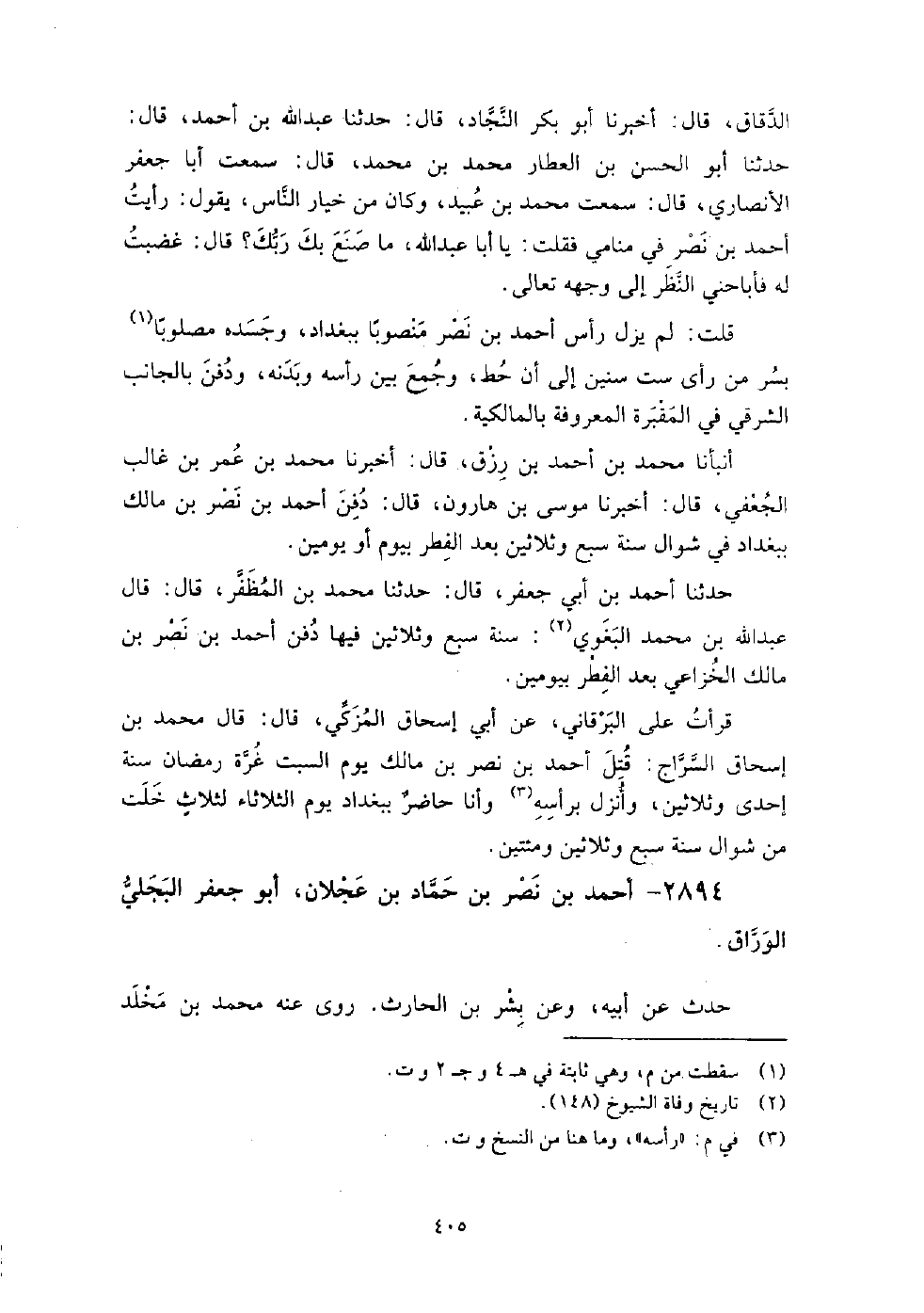 2894 - أَحْمَد بْن نصر بْن حماد بْن عجلان أَبُو جَعْفَر البجلي الوراق حدث عَن أَبِيهِ، وعن بشر بْن الحارث، روى عنه: مُحَمَّد بْن مخلد الدوري، وعبيد اللَّه بْن عَبْد الرحمن السكري، إلا أن عبيد اللَّه سماه محمدا.