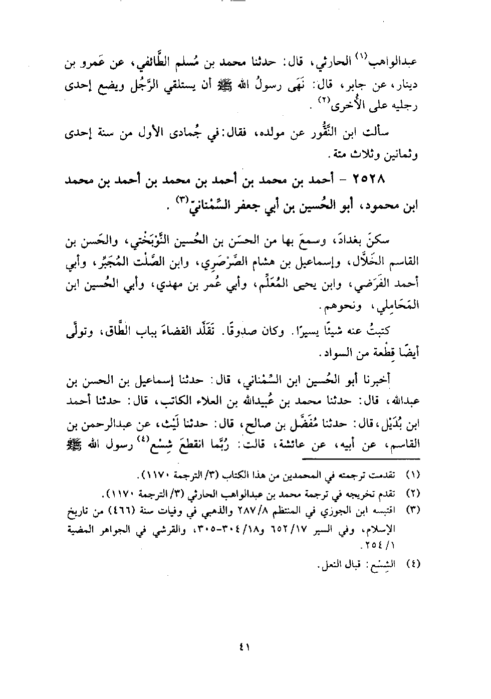 (1617) -[6: 41] أَخْبَرَنَا أَبُو الْحُسَينِ ابْنُ السِّمْنَانِيِّ، قَالَ: حَدَّثَنَا إِسْمَاعِيلُ بْنُ الْحَسَنِ بْنِ عَبْدِ اللَّهِ، قَالَ: حَدَّثَنَا مُحَمَّدُ بْنُ عُبَيْدِ اللَّهِ بْنِ الْعَلاءِ الْكَاتِبُ، قَالَ: حَدَّثَنَا أَحْمَدُ بْنُ بُدَيْلٍ، قَالَ: حَدَّثَنَا مُفَضَّلُ بْنُ صَالِحٍ، قَالَ: حَدَّثَنَا لَيْثٌ عَنْ عَبْدِ الرَّحْمَنِ بْنِ الْقَاسِمِ، عَنْ أَبِيهِ، عَنْ عَائَشَةَ، قَالَتْ: " رُبَّمَا انْقَطَعَ شِسْعُ رَسُولِ اللَّهِ صَلَّى اللَّهُ عَلَيْهِ وَسَلَّمَ فَيَمْشِي فِي نَعْلٍ حَتَّى يُصْلِحَ الأُخْرَى " ولد السمناني بسمنان في شعبان سنة أربع وثمانين وثلاث مائة.