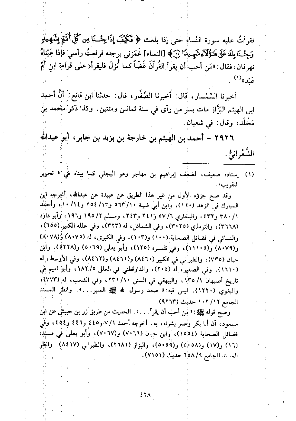 2926 - أَحْمَد بْن الهيثم بْن خارجة بْن يزيد بْن جابر أَبُو عَبْد اللَّهِ الشعراني حدث عَن إسماعيل بْن أَبِي أويس، روى عنه: عَبْد الصمد بْن عَلِيّ الطستي.
