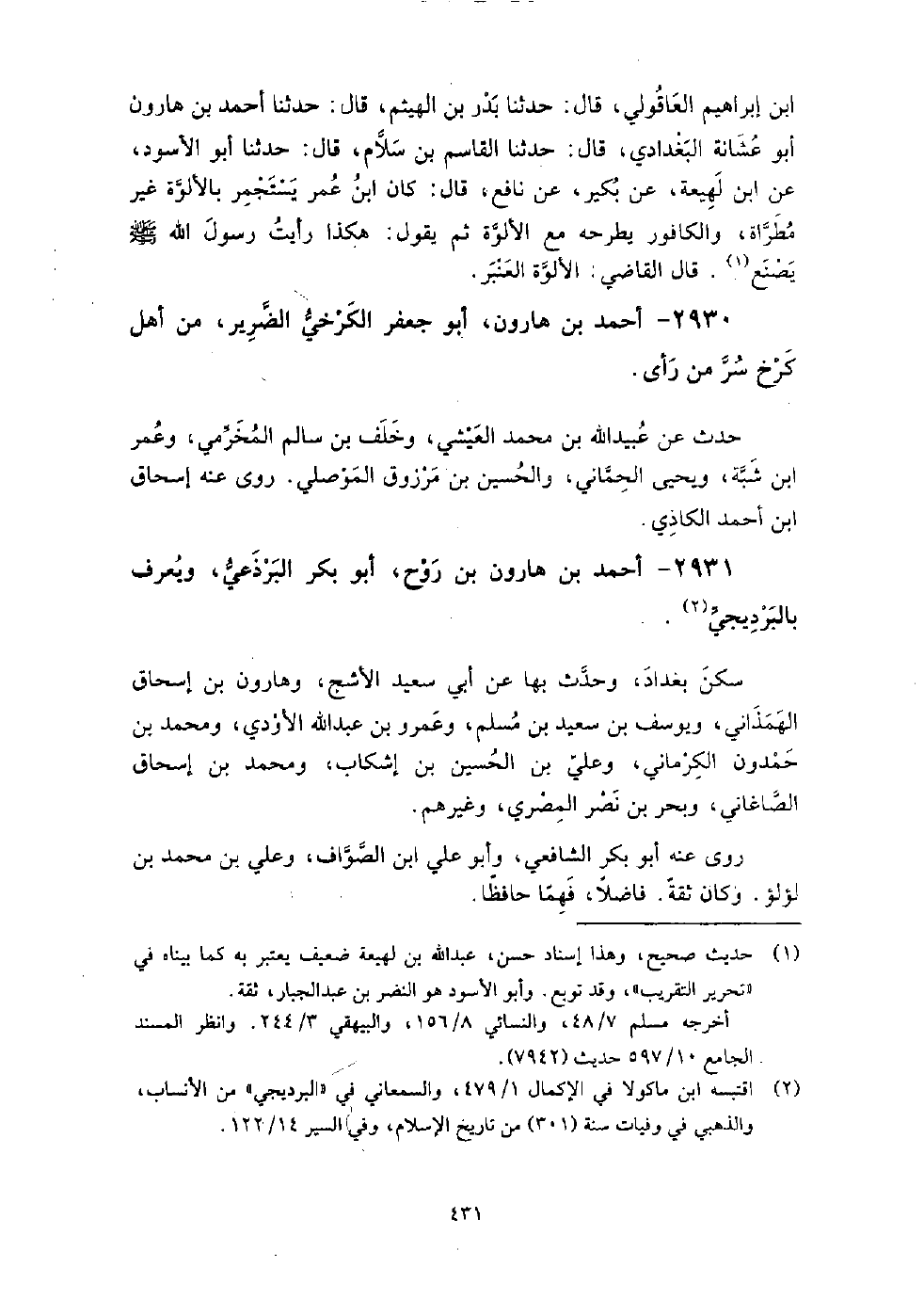 2931 - أَحْمَد بْن هارون بْن روح أَبُو بَكْر البرذعي ويعرف بالبرديجي سكن بغداد، وحدث بِهَا عَن أَبِي سَعِيد الأشج، وهارون بْن إِسْحَاق الهمداني، ويوسف بن سعيد بن مسلم، وعمرو بن عبد الله الأودي، ومحمد بن حمدون الكرماني، وعلي بن الحسين بن إشكاب، ومحمد بن إسحاق الصاغاني، وبحر بن نصر المصري، وغيرهم.