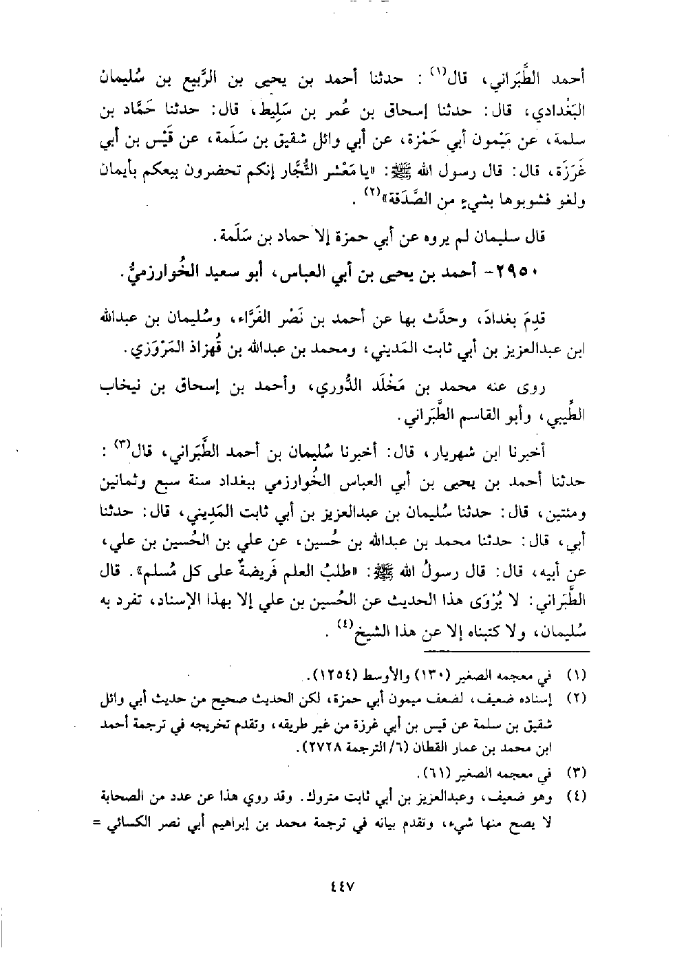 2950 - أَحْمَد بْن يَحْيَى بْن أَبِي الْعَبَّاس أَبُو سَعِيد الخوارزمي قدم بغداد، وحدث بِهَا عَن أَحْمَد بْن نصر الفراء، وسليمان بْن عَبْد اللَّهِ بْن عَبْد العزيز بْن أَبِي ثابت المديني، ومحمد بْن عَبْد اللَّهِ بْن قهزاد الْمَرْوَزِيُّ.