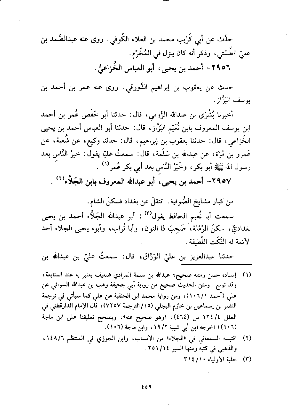 2957 - أَحْمَد بْن يَحْيَى أَبُو عَبْد اللَّهِ المعروف بابن الجلاء من كبار مشايخ الصوفِية، انتقل عَن بغداد، فسكن الشام.