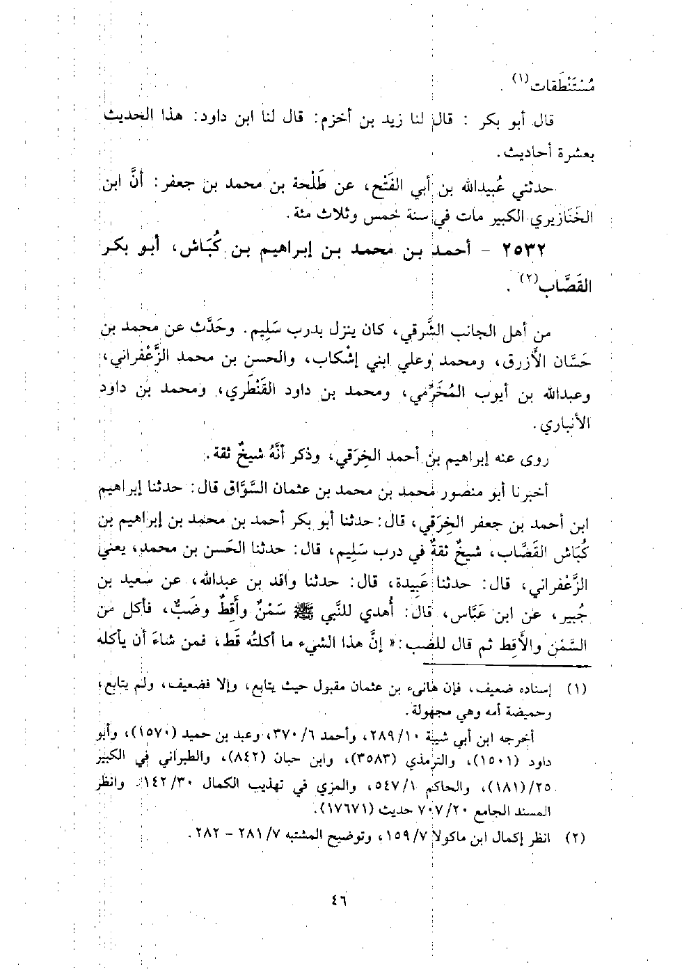 2532 - أَحْمَد بْن مُحَمَّد بْن إِبْرَاهِيم بْن كباش أَبُو بَكْر القصاب من أهل الجانب الشرقي، كَانَ ينزل بدرب سليم، وحدث عَن مُحَمَّد بْن حسان الأزرق، ومحمد، وعلي ابني إشكاب، وَالحسن بْن مُحَمَّد الزعفراني، وعبد اللَّه بْن أيوب المخرمي، ومحمد بْن داود القنطري، ومحمد بْن داود الأنباري.