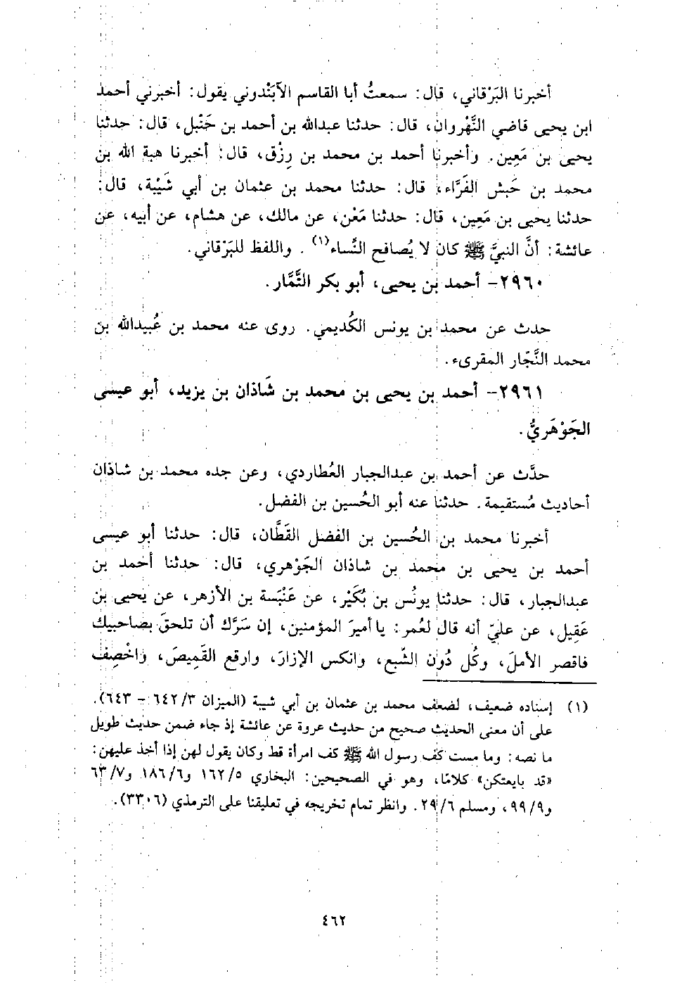 2961 - أَحْمَد بْن يَحْيَى بْن مُحَمَّد بْن شاذان بْن يزيد أَبُو عِيسَى الجوهري حدث عَن أَحْمَد بْن عَبْد الجبار العطاردي، وعن جده مُحَمَّد بْن شاذان أحاديث مستقيمة، حَدَّثَنَا عنه: أَبُو الحسين بْن الفضل.