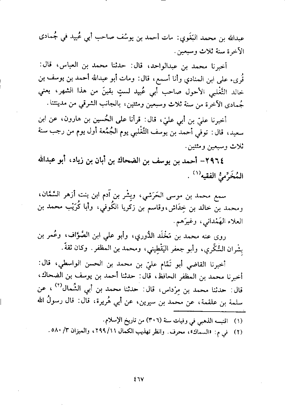 2964 - أَحْمَد بْن يُوسُف بْن الضحاك بْن أبان بْن زياد أَبُو عَبْد اللَّهِ المخرمي الفقيه سمع مُحَمَّد بْن مُوسَى الحرشي، وبشر بْن آدم ابْن بنت أزهر السمان، ومحمد بْن خالد بْن خداش، وقاسم بْن زكريا الكوفِي، وأبا كريب مُحَمَّد بْن العلاء الهمذاني، وغيرهم.