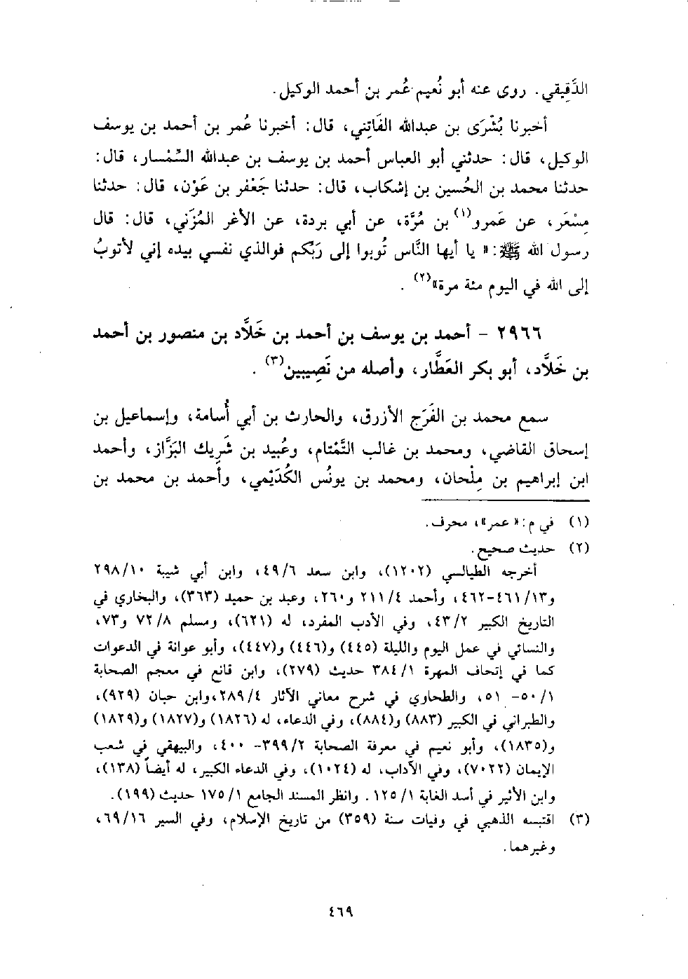 2966 - أَحْمَد بْن يُوسُف بْن أَحْمَد بْن خلاد بْن منصور بْن أَحْمَد بْن خلاد أَبُو بَكْر العطار وأصله من نصيبين، سمع مُحَمَّد بْن الفرج الأزرق، وَالحارث بْن أَبِي أسامة، وإسماعيل بْن إِسْحَاق الْقَاضِي، ومحمد بْن غالب التمتام، وعبيد بْن شريك البزاز، وأَحْمَد بْن إِبْرَاهِيم بْن ملحان، ومحمد بْن يونس الكديمي، وأَحْمَد بْن مُحَمَّد بْن صاعد، وإبراهيم بْن إِسْحَاق الحربي، وإِسْحَاق بْن الْحَسَن الحربي، ومحمد بْن عثمان بْن أَبِي شيبة.