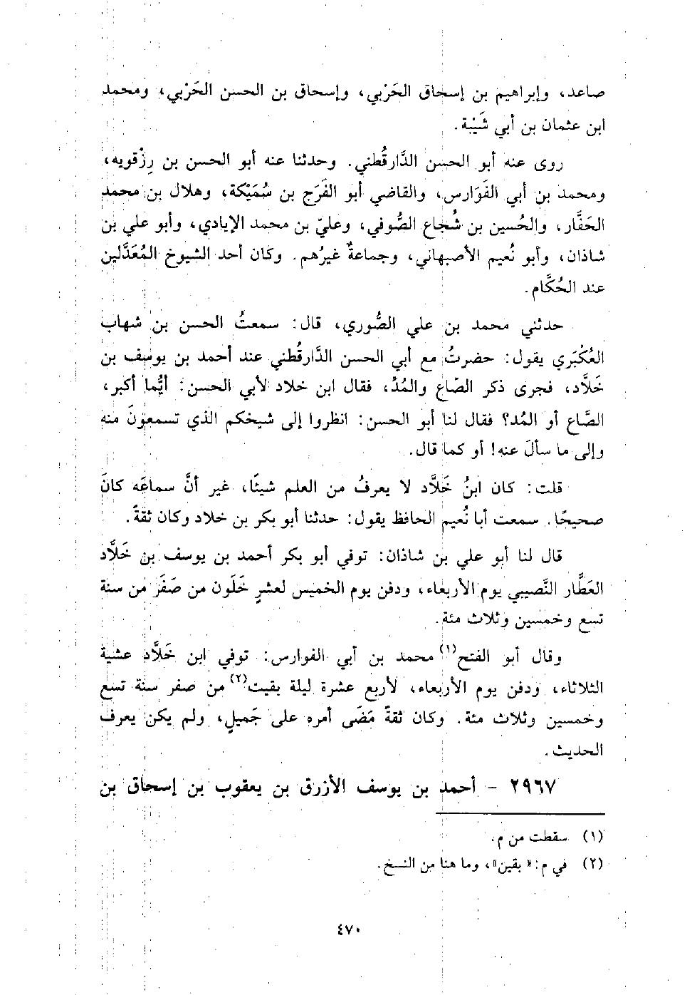 2967 - أَحْمَد بْن يُوسُف الأزرق بْن يَعْقُوب بْن إِسْحَاق بْن البهلول بْن حسان بْن سنان أَبُو الْحَسَن التنوخي أنباري الأصل، حدث عَن عُمَر بْن إسماعيل بْن أَبِي غيلان الثقفِي، ومحمد بْن جرير الطبري، وعبد اللَّه بْن إِسْحَاق المدائني، وإِسْحَاق بْن بنان بْن معن الأنماطي، ومحمد بْن مُحَمَّد الباغندي، وأَحْمَد بْن عَبْد اللَّهِ بْن سابور الدقاق، وأَحْمَد بْن مُحَمَّد بْن أَبِي العجوز، وأبي صخرة الكاتب، وأَحْمَد بْن عِيسَى بْن السكين البلدي، وأبي الليث الفرائضي، وأخيه أَحْمَد بْن الْقَاسِم، وعبد اللَّه بْن مُحَمَّد البغوي، وغيرهم من هذه الطبقة.