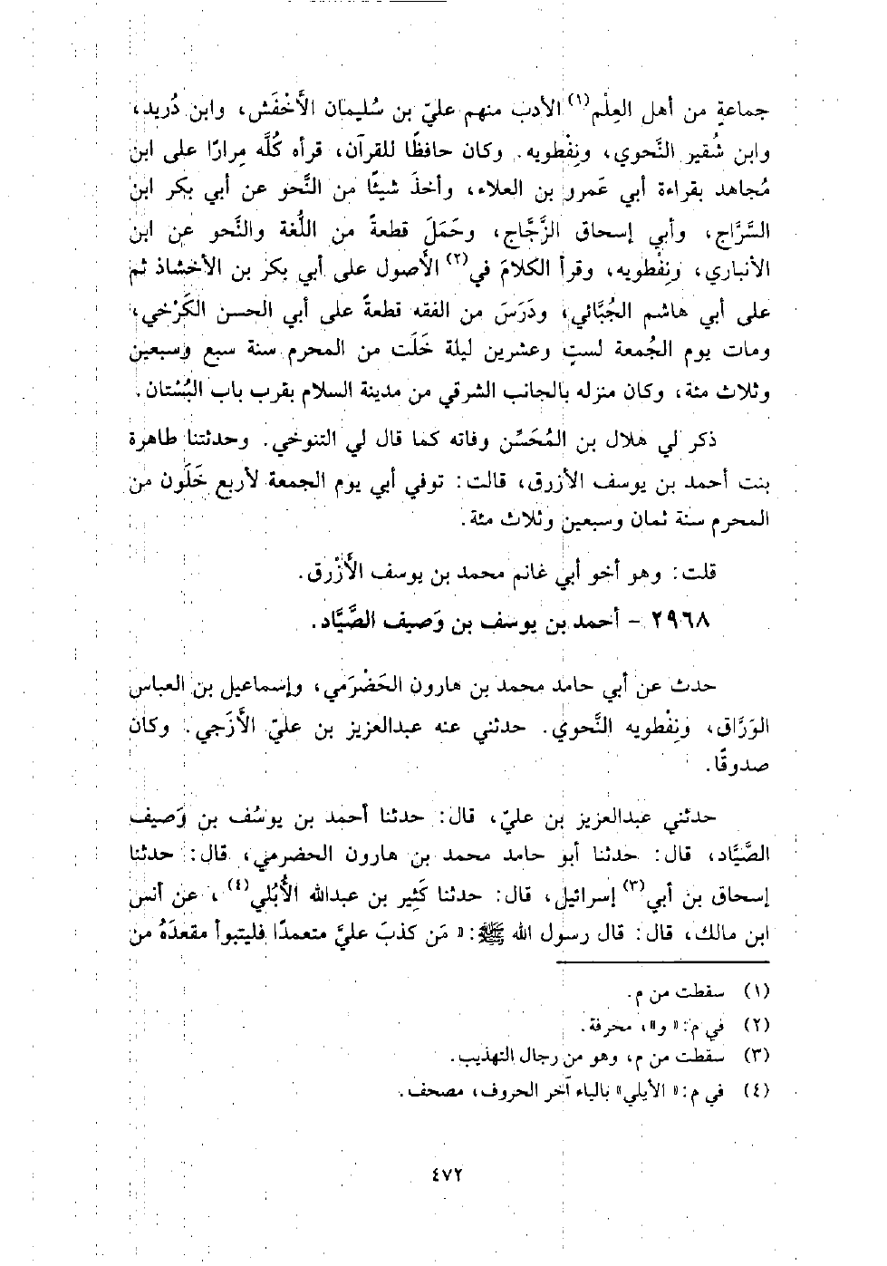 2968 - أَحْمَد بْن يُوسُف بْن وصيف الصياد حدث عَن أَبِي حامد مُحَمَّد بْن هارون الحضرمي، وإسماعيل بْن الْعَبَّاس الوراق، ونفطويه النحوي، حَدَّثَنِي عنه عَبْد العزيز بْن عَلِيّ الأزجي، وكَانَ صدوقا.