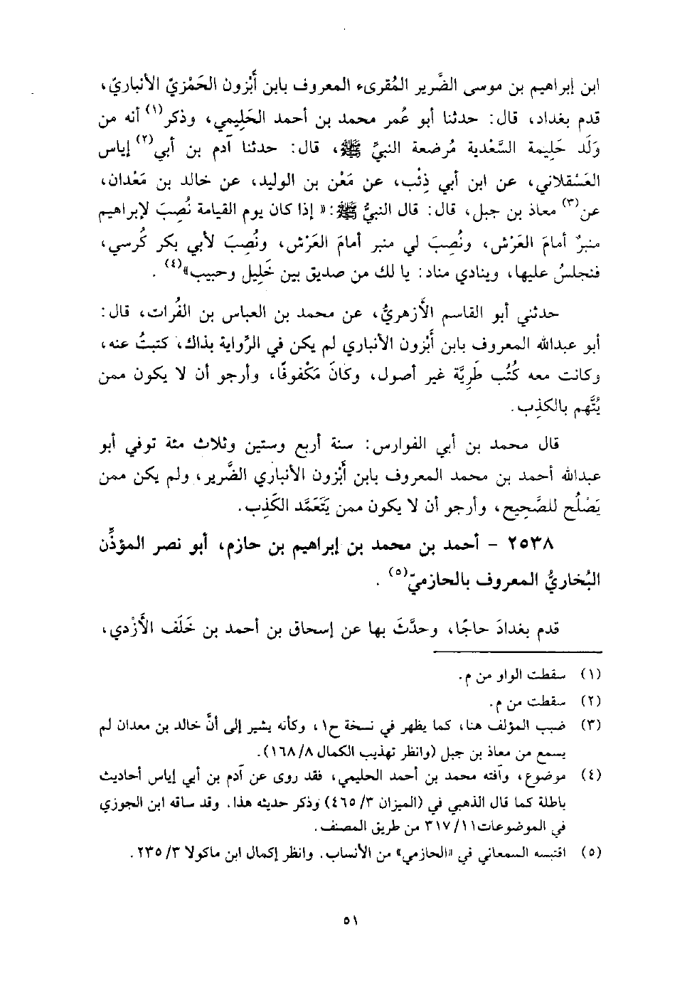 2538 - أَحْمَد بْن مُحَمَّد بْن إِبْرَاهِيم بْن حازم أَبُو نصر المؤذن البخاري المعروف بالحازمي قدم بغداد حاجا، وحدث بها عَن إسحاق بْن أَحْمَد بْن خلف الأزدي، وعبد اللَّه بْن مُحَمَّد بْن يعقوب الحارثي، وعبد الرحمن بْن مُحَمَّد بْن حريث البخاريين، وَالهيثم بْن كليب الشاشي.