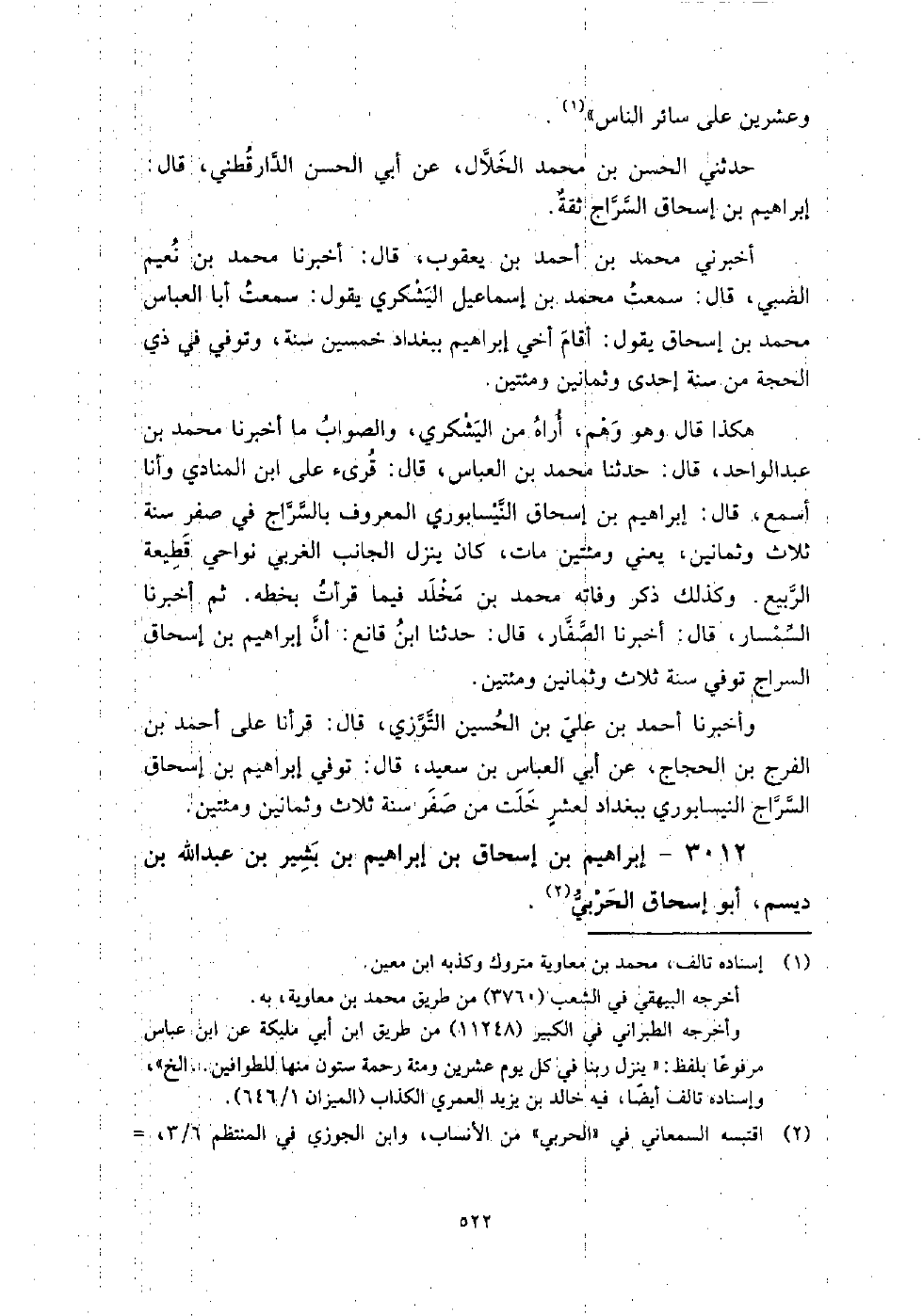 3012 - إِبْرَاهِيم بْن إِسْحَاق بْن إِبْرَاهِيم بْن بشير بْن عَبْد اللَّهِ بْن ديسم أَبُو إِسْحَاق الحربي ولد فِي سنة ثمان وتسعين ومائة، وسمع أبا نعيم الفضل بْن دكين، وعفان بْن مسلم، وعبد اللَّه بْن صَالِح العجلي، ومُوسَى بْن إسماعيل التبوذكي، وأبا عُمَر الحوضي، ومسددا، وعبيد اللَّه بْن مُحَمَّد بْن عائشة، وعمرو بْن مرزوق، وسعيد بْن سُلَيْمَان الواسطي، وعلي بْن الجعد، وخلف بْن هِشَام، وعاصم بْن عَلِيّ، ومحمد بْن مقاتل الْمَرْوَزِيُّ، وأَحْمَد بْن يونس، ومحمد بْن بكار بْن الريان، وقتيبة بْن سَعِيد، ويحيى ابْن الحماني، وأَحْمَد بْن حَنْبَل، وعثمان بْن أَبِي شيبة، وعبيد اللَّه القواريري، وخلقا من أمثالهم.