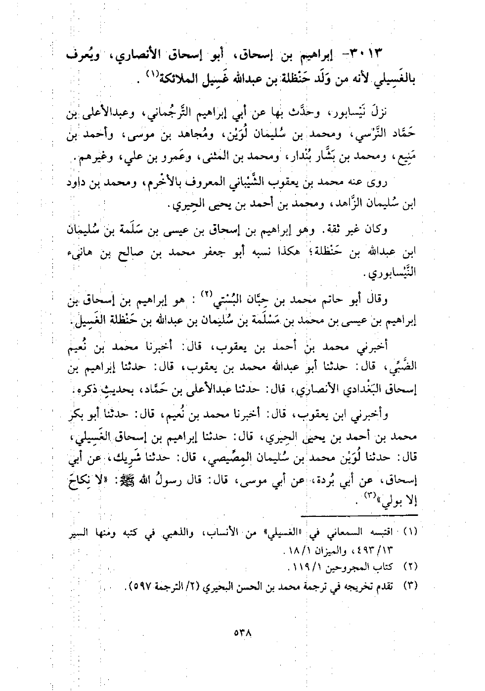 3013 - إِبْرَاهِيم بْن إِسْحَاق أَبُو إِسْحَاق الأنصاري ويعرف بالغسيلي لأنه من ولد حنظلة بْن عَبْد اللَّهِ غسيل الملائكة نزل نيسابور، وحدث بِهَا عَن أَبِي إِبْرَاهِيم الترجماني، وعبد الأعلى بْن حماد النرسي، ومحمد بْن سُلَيْمَان لوين، ومجاهد بْن مُوسَى، وأَحْمَد بْن منيع، ومحمد بْن بشار بندار، ومحمد بْن المثنى، وعمرو بْن عَلِيّ، وغيرهم.
