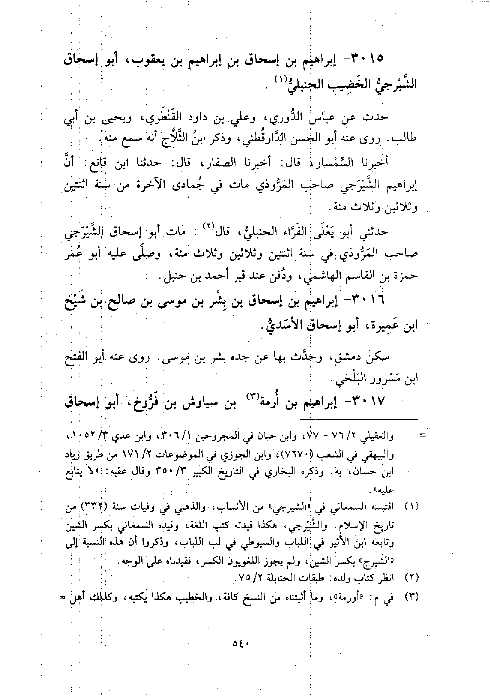 3015 - إِبْرَاهِيم بْن إِسْحَاق بْن إِبْرَاهِيم بْن يَعْقُوب أَبُو إِسْحَاق الشيرجي الخضيب الحَنْبَلي حدث عَن عَبَّاس الدوري، وعلي بْن داود القنطري، ويحيى بْن أَبِي طَالِب، روى عنه: أَبُو الْحَسَن الدارقطني، وذكر ابْن الثلاج أنه سمع منه.
