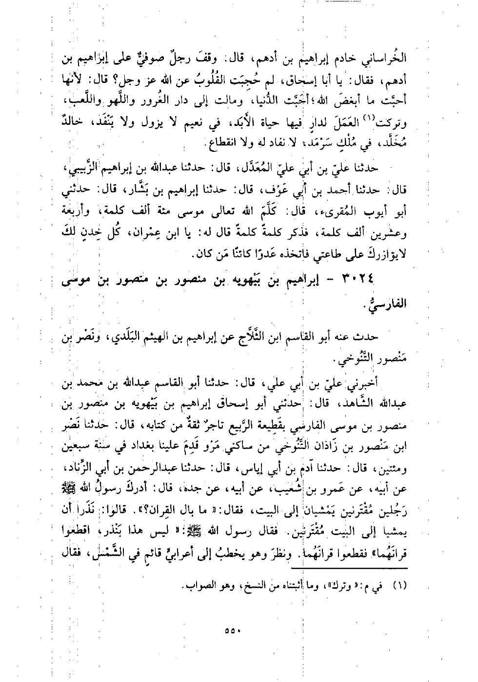(1920) -[6: 550] أَخْبَرَنِي عَلِيُّ بْنُ أَبِي عَلِيٍّ، قَالَ: حَدَّثَنَا أَبُو الْقَاسِمِ عَبْدُ اللَّهِ بْنُ مُحَمَّدِ بْنِ عَبْدِ اللَّهِ الشَّاهِدُ، قَالَ: حَدَّثَنِي أَبُو إِسْحَاقَ إِبْرَاهِيمُ بْنُ بَيْهَوَيْهِ بْنِ مَنْصُورِ بْنِ مَنْصُورِ بْنِ مُوسَى الْفَارِسِيُّ بِقَطِيعَةِ الرَّبِيعِ تَاجِرٌ ثِقَةٌ مِنْ كِتَابِهِ، قَالَ: حَدَّثَنَا نَصْرُ بْنُ مَنْصُورِ بْنِ زَاذَانَ التَّنُوخِيُّ مِنْ سَاكِنِي مَرْوَ قَدِمَ عَلَيْنَا بَغْدَادَ فِي سَنَةِ سَبْعِينَ وَمِائَتَيْنِ، قَالَ: حَدَّثَنَا آدَمُ بْنُ أَبِي إِيَاسٍ، قَالَ: حَدَّثَنَا عَبْدُ الرَّحْمَنِ بْنُ أَبِي الزِّنَادِ، عَنْ أَبِيهِ، عَنْ عَمْرِو بْنِ شُعَيْبٍ، عَنْ أَبِيهِ، عَنْ جَدِّهِ، قَالَ: أَدْرَكَ رَسُولُ اللَّهِ صَلَّى اللَّهُ عَلَيْهِ وَسَلَّمَ رَجُلَيْنِ مُقْرَنَيْنِ يَمْشِيَانِ إِلَى الْبَيْتِ، فَقَالَ: " مَا بَالُ الْقِرَان؟ " قَالُوا: نَذَرَا أَنْ يَمْشِيَا إِلَى الْبَيْتِ مُقْرَنَيْنِ، فَقَالَ رَسُولُ اللَّهِ صَلَّى اللَّهُ عَلَيْهِ وَسَلَّمَ: " لَيْسَ هَذَا بِنَذْرٌ، اقْطَعُوا قِرَانَهُمَا " فَقَطَعُوا قِرَانَهُمَا، وَنَظَرَ وَهُوَ يَخْطُبُ إِلَى أَعْرَابِيٍّ قَائِمٍ فِي الشَّمْسِ، فَقَالَ لَهُ: " مَا شَأْنُكَ؟ "، فَقَالَ: يَا رَسُولَ اللَّهِ نَذَرْتُ أَنْ لا أَزَالَ قَائِمًا فِي الشَّمْسِ حَتَّى تَفْرُغَ، فَقَالَ لَهُ رَسُولُ اللَّهِ صَلَّى اللَّهُ عَلَيْهِ وَسَلَّمَ: " لَيْسَ هَذَا بِنَذْرٍ، إِنَّمَا النَّذْرُ مَا ابْتُغِيَ بِهِ وَجْهُ اللَّهِ عَزَّ وَجَلَّ وَتَبَارَكَ وَتَعَالَى "
