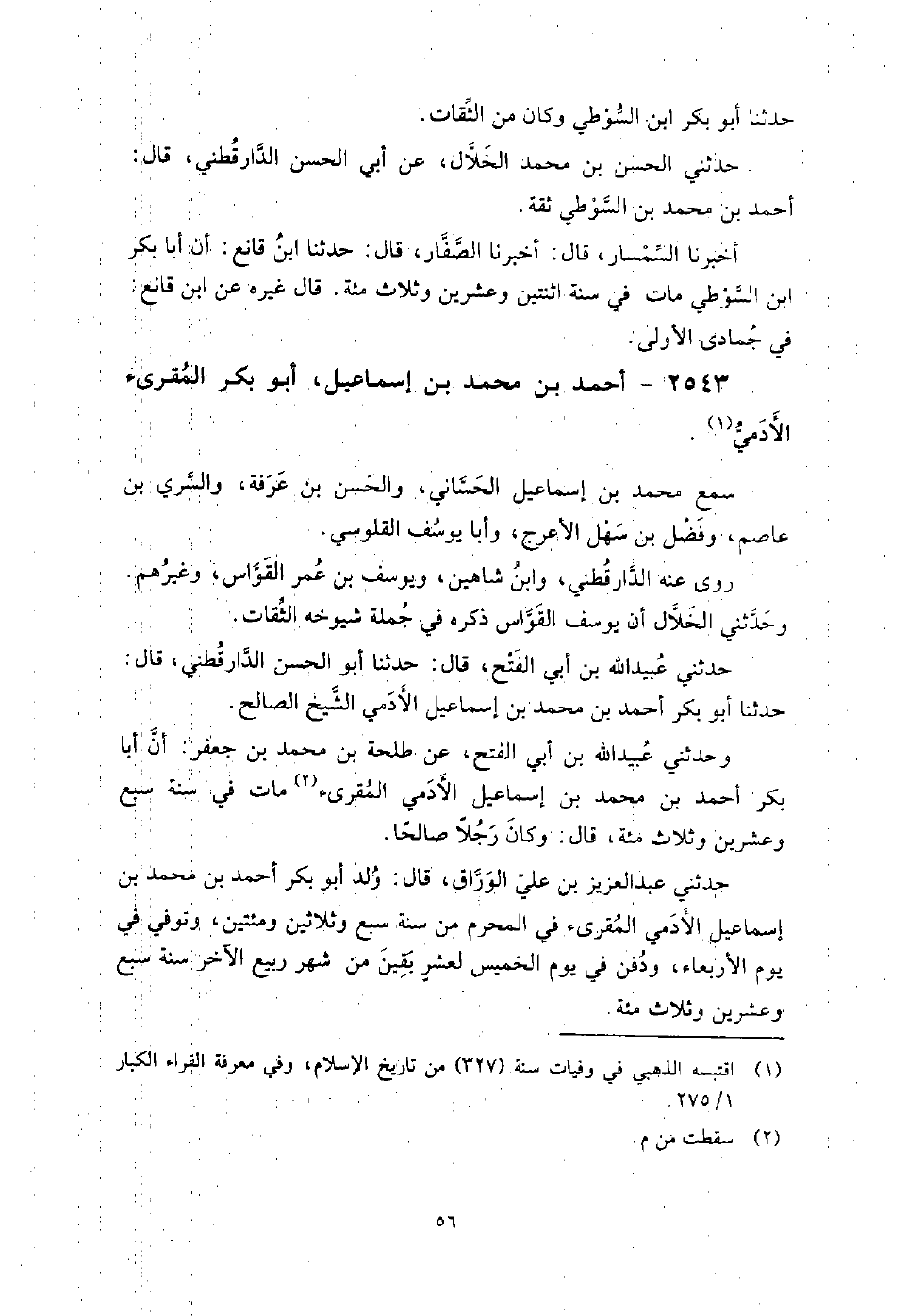 2543 - أَحْمَد بْن مُحَمَّد بْن إسماعيل أَبُو بَكْر المقرئ الأدمي سمع مُحَمَّد بْن إسماعيل الحساني، وَالحسن بْن عرفة، وَالسري بْن عاصم، وفضل بْن سهل الأعرج، وأبا يوسف القلوسي.