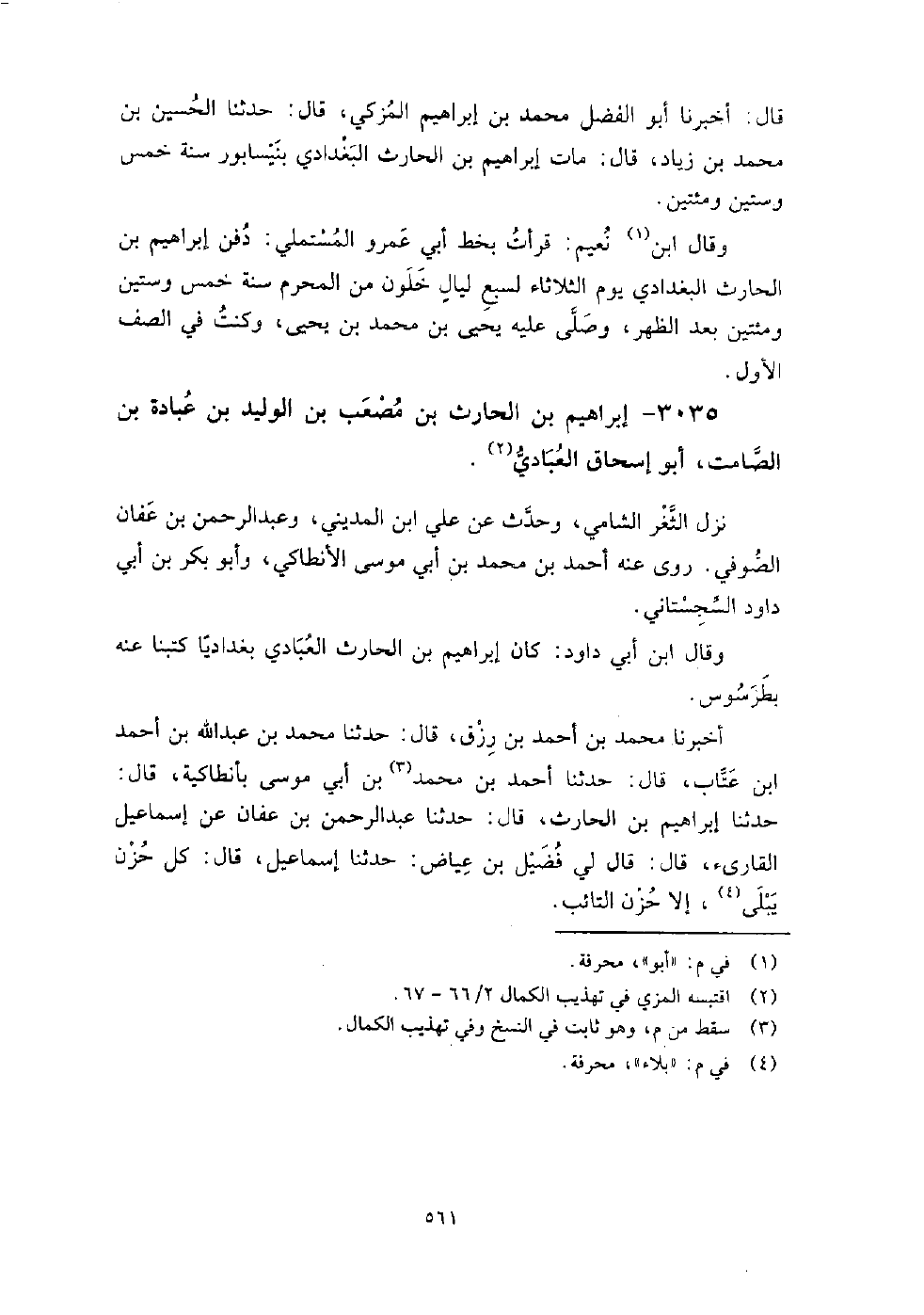 3035 - إِبْرَاهِيم بْن الحارث بْن مصعب بْن الوليد بْن عبادة بْن الصامت أَبُو إِسْحَاق العبادي نزل الثغر الشامي، وحدث عَن عَلِيّ ابن المديني، وعبد الرحمن بْن عفان الصوفِي، روى عنه: أَحْمَد بْن مُحَمَّد بْن أَبِي مُوسَى الأنطاكي، وأبو بكر بْن أَبِي داود السجستاني.