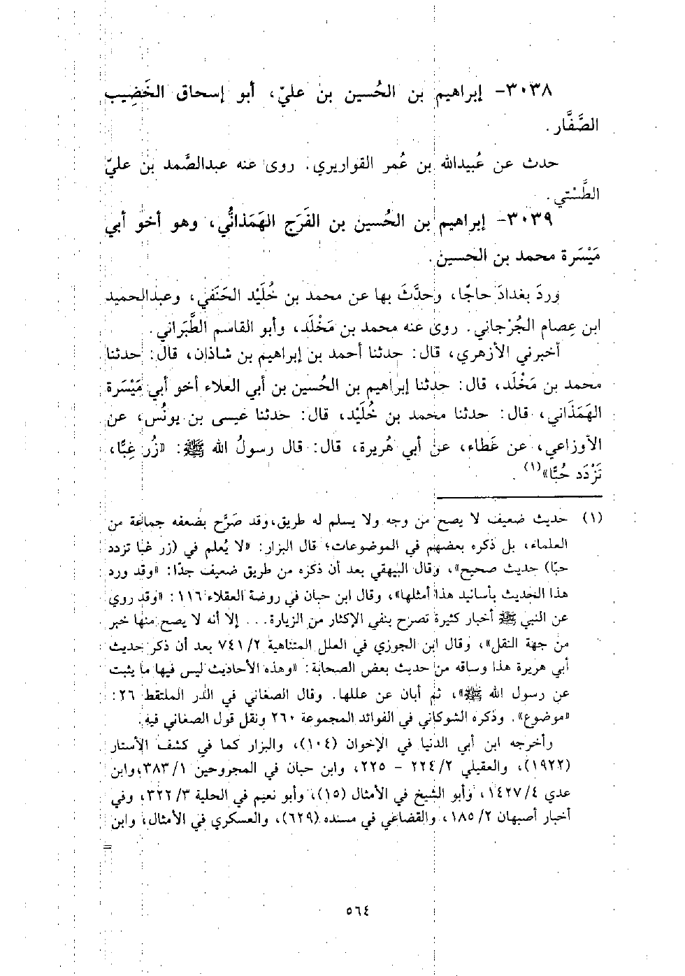 3038 - إِبْرَاهِيم بْن الحسين بْن عَلِيّ أَبُو إِسْحَاق الخضيب الصفار حدث عَن عبيد اللَّه بْن عُمَر القواريري، روى عنه: عَبْد الصمد بْن عَلِيّ الطستي