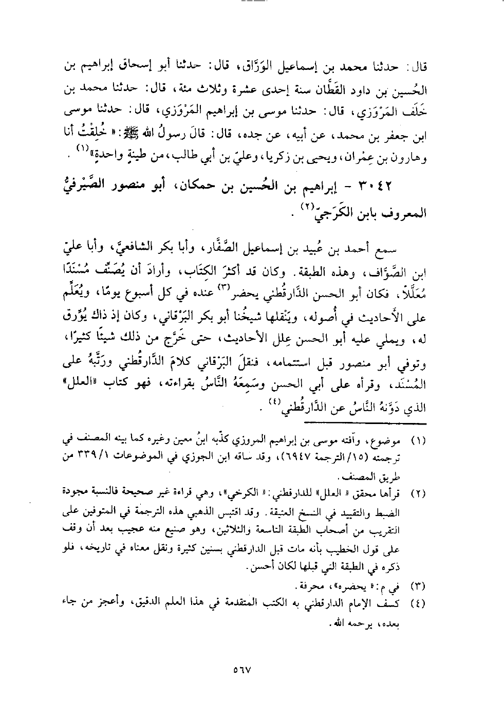 3042 - إِبْرَاهِيم بْن الحسين بْن حكمان أَبُو منصور الصيرفِي المعروف بابن الكرجي سمع أَحْمَد بْن عبيد بْن إسماعيل الصفار، وأبا بكر الشافعي، وأبا عَلِيّ ابن الصواف، وهذه الطبقة، وكَانَ قد أكثر الكتاب، وأراد أن يصنف مسندا معللا، فكَانَ أَبُو الْحَسَن الدارقطني يحضر عنده فِي كل أسبوع يوما، ويعلم عَلَى الأحاديث فِي أصوله، وينقلها شيخنا أَبُو بَكْر الْبَرْقَانِيّ، وكَانَ إذ ذاك يورق له، ويملي عَلَيْهِ أَبُو الْحَسَن علل الأحاديث، حتى خرج من ذلك شيئا كثيرا، وتوفِي أَبُو منصور قبل استتمامه، فنقل الْبَرْقَانِيّ كلام الدارقطني، ورتبه عَلَى المسند، وقرأه عَلَى أَبِي الْحَسَن، وسمعه الناس بقراءته، فهو كتاب العلل الَّذِي دونه الناس عَنِ الدارقطني.