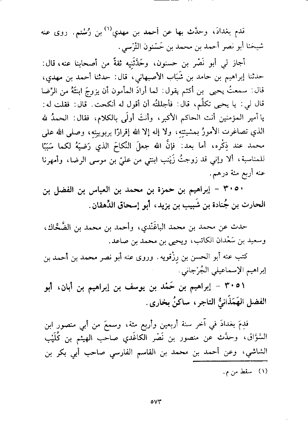 3051 - إِبْرَاهِيم بْن حمد بْن يُوسُف بْن إِبْرَاهِيم بْن أبان أَبُو الفضل الهمذاني التاجر ساكن بخارى قدم بغداد فِي آخر سنة أربعين وأربع مائة، وسمع من أَبِي منصور ابْن السواق، وحدث عَن منصور بْن نصر الكاغدي صاحب الهيثم بْن كليب الشاشي، وعن أَحْمَد بْن مُحَمَّد بْن الْقَاسِم الفارسي صاحب أَبِي بكر بْن خنب، وعن غيرهما.