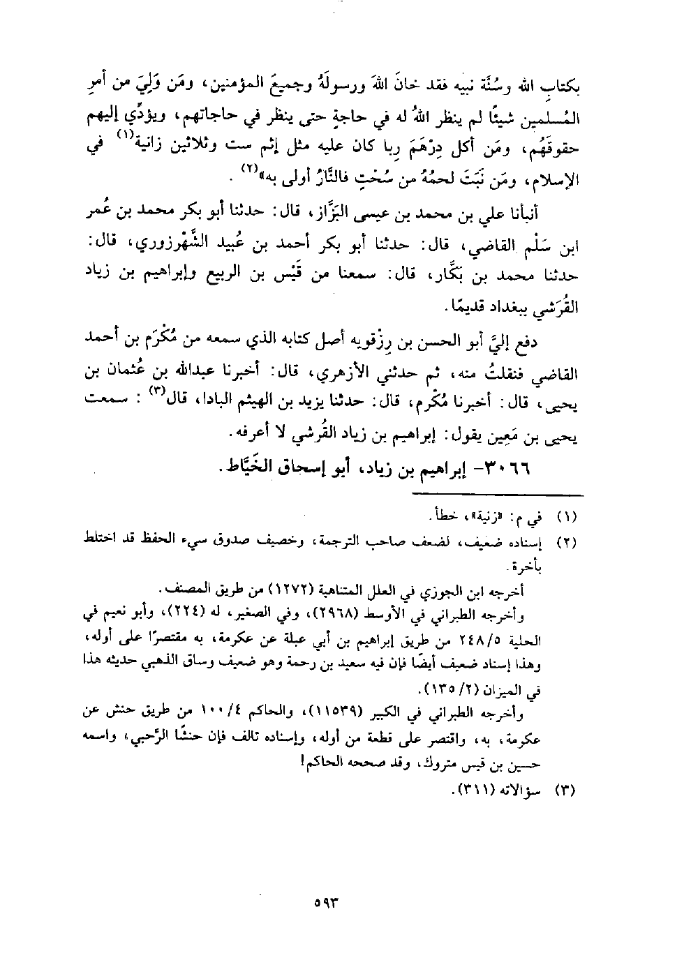 3066 - إِبْرَاهِيم بْن زياد أَبُو إِسْحَاق الخياط سمع شريك بْن عَبْد اللَّهِ النخعي، وإبراهيم بْن سعد الزهري، وَالفرج بْن فضالة، وأبا عوانة، وسوار بْن مصعب، وغيرهم.