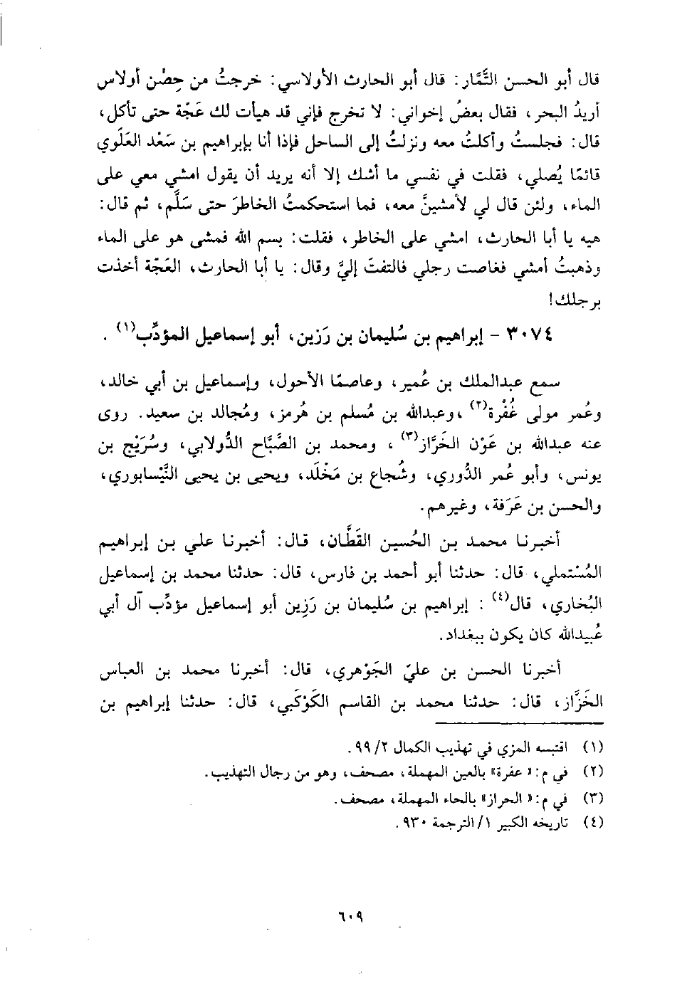 3074 - إِبْرَاهِيم بْن سُلَيْمَان بْن رزين أَبُو إسماعيل المؤدب سمع عَبْد الملك بْن عمير، وعاصما الأحول، وإسماعيل بْن أَبِي خالد، وعمر مولى غفرة، وعبد اللَّه بْن مسلم بْن هرمز، ومجالد بْن سَعِيد، روى عنه: عَبْد اللَّهِ بْن عون الخراز، ومحمد بْن الصباح الدولابي، وسريج بْن يونس، وأبو عُمَر الدوري، وشجاع بْن مخلد، ويحيى بْن يَحْيَى النِّيسَابُورِيّ، وَالحسن بْن عرفة، وغيرهم.