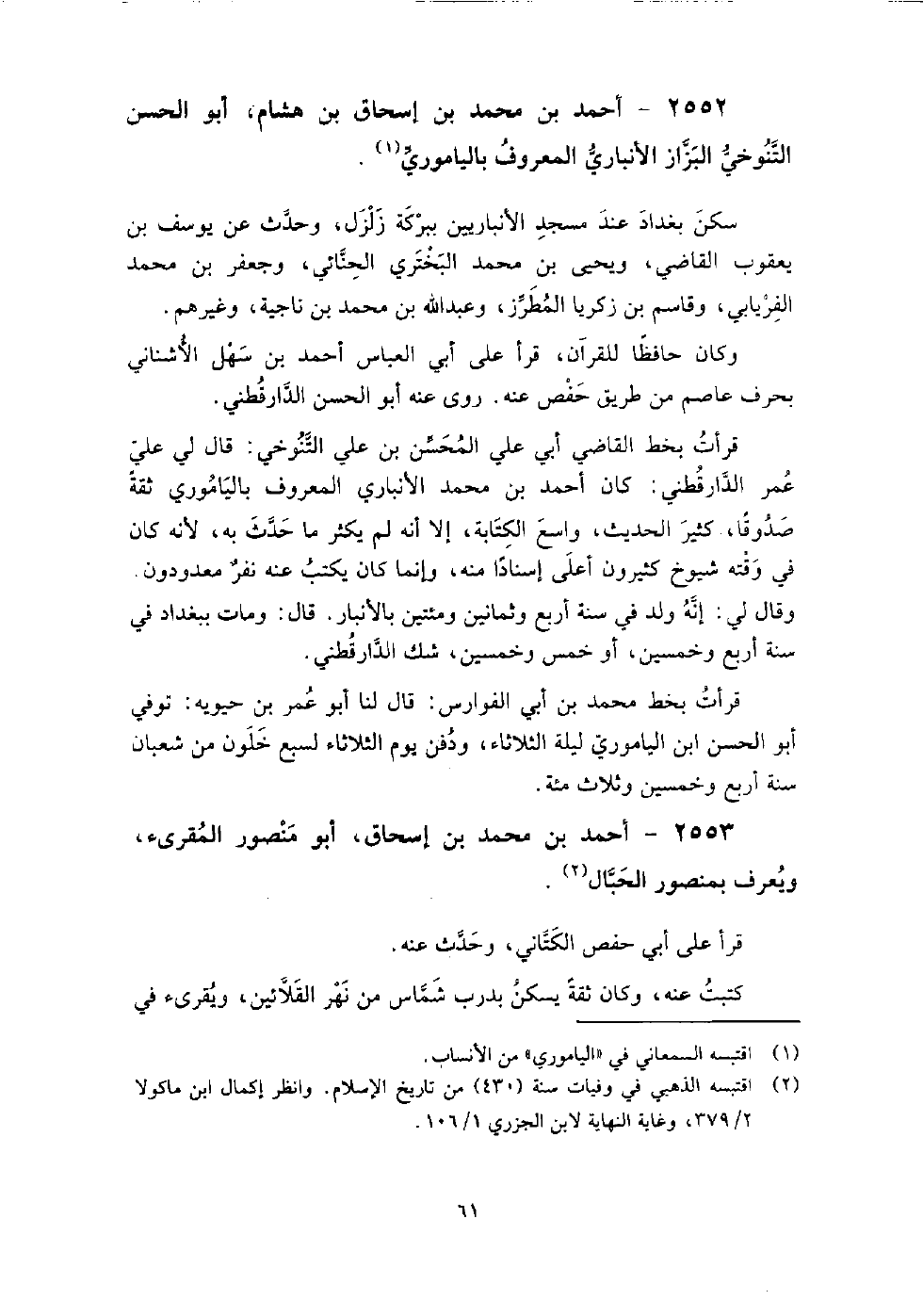 2552 - أَحْمَد بْن مُحَمَّد بْن إسحاق بْن هشام أَبُو الحسن التنوخي البزاز الأنباري المعروف بالياموري