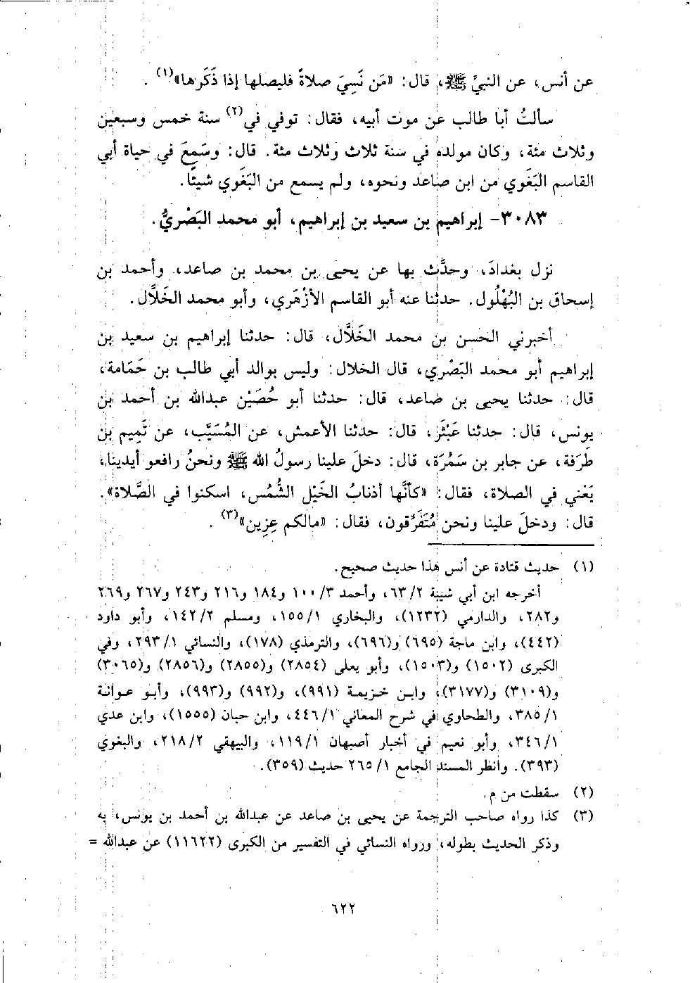 3083 - إِبْرَاهِيم بْن سَعِيد بْن إِبْرَاهِيم أَبُو مُحَمَّد البصري نزل بغداد، وحدث بِهَا عَن يَحْيَى بْن مُحَمَّد بْن صاعد، وأَحْمَد بْن إِسْحَاق بْن البهلول، حَدَّثَنَا عنه أَبُو الْقَاسِم الأزهري، وأبو مُحَمَّد الخلال.