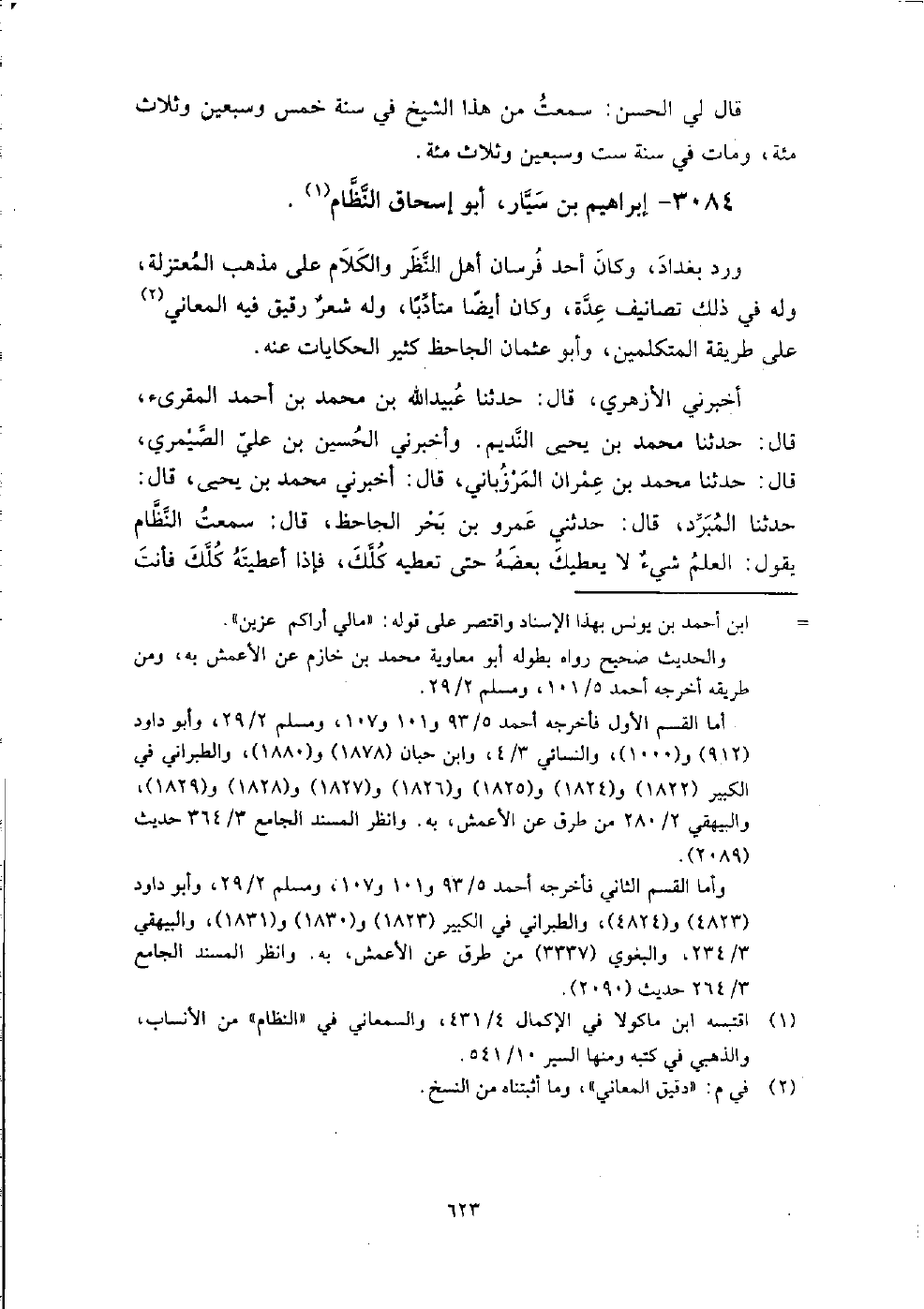 3084 - إِبْرَاهِيم بْن سيار أَبُو إِسْحَاق النظام ورد بغداد، وكَانَ أحد فرسان أهل النظر وَالكلام عَلَى مذهب المعتزلة، وله فِي ذلك تصانيف عدة، وكَانَ أيضا متأدبا، وله شعر دقيق المعاني عَلَى طريقة المتكلمين، وأبو عثمان الجاحظ كثير الحكايات عنه.