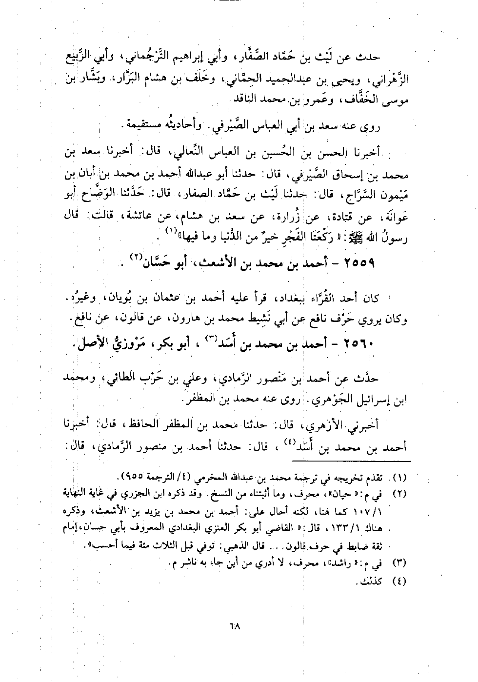 2560 - أَحْمَد بْن مُحَمَّد بْن أسد أَبُو بَكْر مروزي الأصل حدث عَن أَحْمَد بْن منصور الرمادي، وعلى بْن حرب الطائي، ومحمد بْن إسرائيل الجوهري.