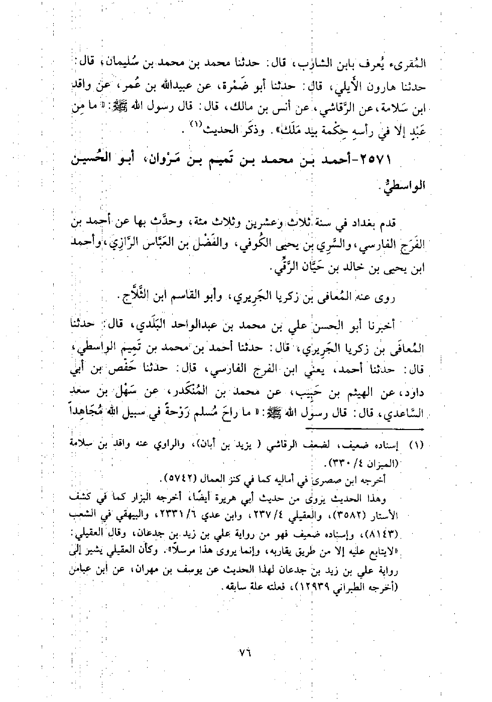 2571 - أَحْمَد بْن مُحَمَّد بْن تميم بْن مروان أَبُو الحسين الواسطي قدم بغداد فِي سنة ثلاث وعشرين وثلاث مائة، وحدث بها عَن أَحْمَد بْن الفرج الفارسي، وَالسري بْن يحيى الكوفي، وَالفضل بْن العباس الرازي، وأَحْمَد بْن يحيى بْن خالد بْن حيان الرقى.