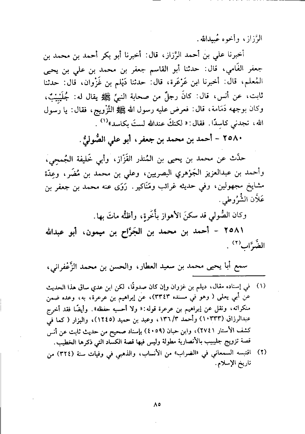 2581 - أَحْمَد بْن مُحَمَّد بْن الجراح بْن ميمون أَبُو عَبْد اللَّه الضراب سمع أبا يحيى مُحَمَّد بْن سعيد العطار، وَالحسن بْن مُحَمَّد الزعفراني، وَالحسن بْن عَبْد العزيز الجروي، ومحمد بْن عَبْد النور الكوفي، ويحيى بْن مُحَمَّد بْن أعين المروزي، وأَحْمَد بْن منصور الرمادي، وسعدان بْن نصر الثقفي.