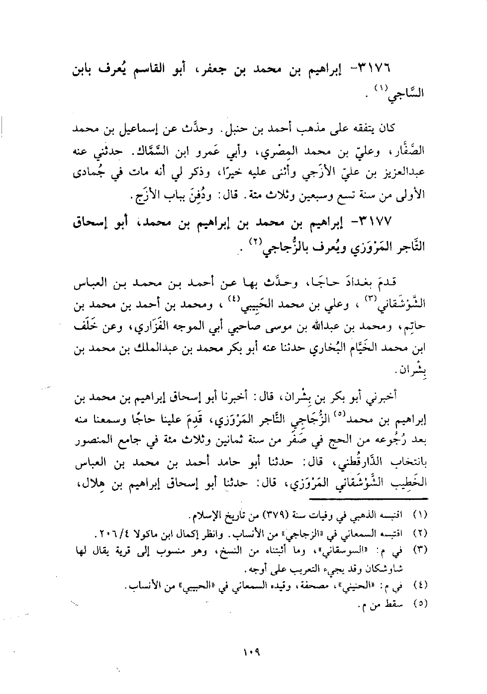 3177 - إبراهيم بن محمد بن إبراهيم بن محمد أبو إسحاق التاجر المروزي ويعرف بالزجاجي قدم بغداد حاجا، وحدث بها عن: أحمد بن محمد بن العباس الشوشقاني، وعلي بن محمد الحبيبي، ومحمد بن أحمد بن محمد بن حاتم، ومحمد بن عبد الله بن موسى صاحبي أبي الموجه الفزاري، وعن خلف بن محمد الخيام البخاري، حدثنا عنه أبو بكر محمد بن عبد الملك بن محمد بن بشران.