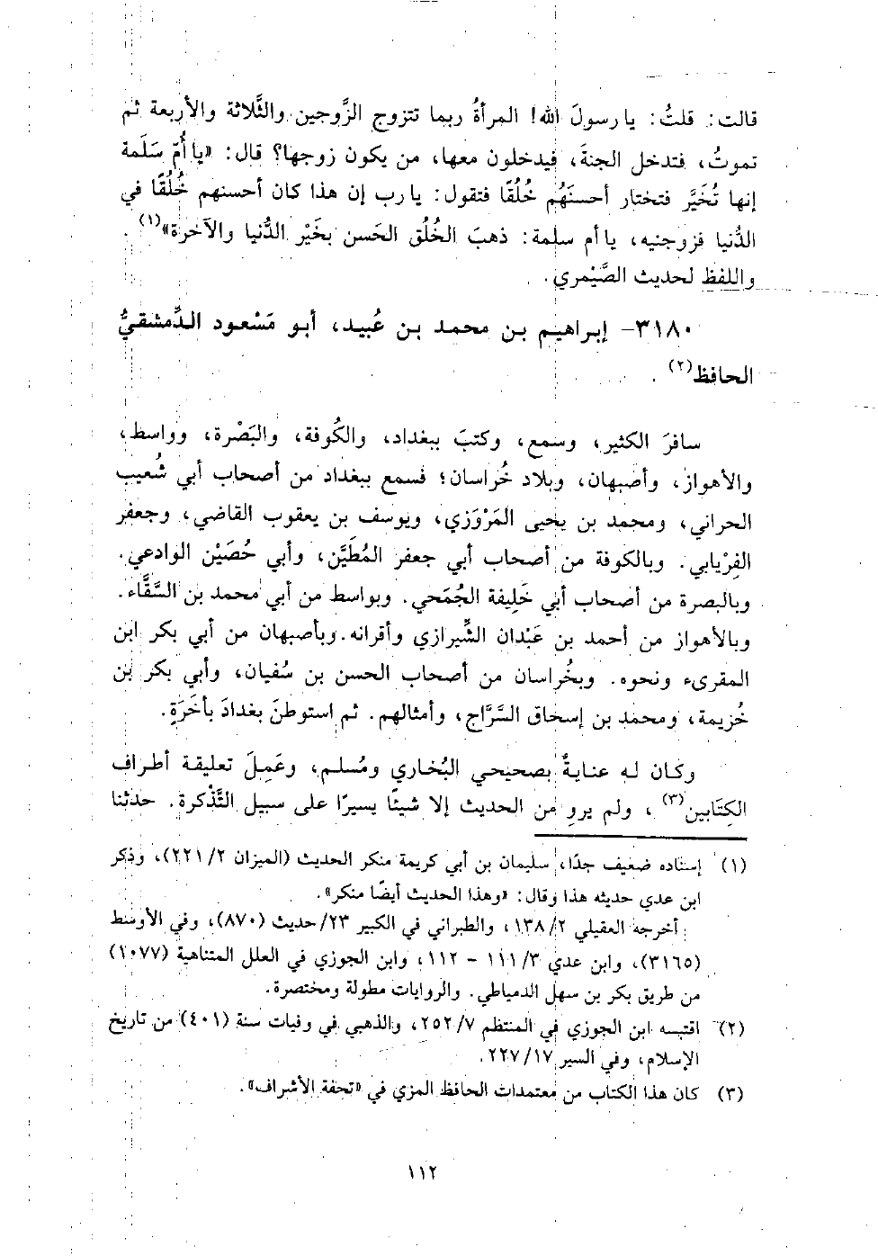 3180 - إبراهيم بن محمد بن عبيد أبو مسعود الدمشقي الحافظ سافر الكثير، وسمع وكتب ببغداد والكوفة والبصرة وواسط والأهواز وأصبهان وبلاد خراسان، فسمع ببغداد من أصحاب أبي شعيب الحراني، ومحمد بن يحيى المروزي، ويوسف بن يعقوب القاضي، وجعفر الفريابي، وبالكوفة من أصحاب أبي جعفر المطين، وأبي الحصين الوادعي، وبالبصرة من أصحاب أبي خليفة الجمحي، وبواسط من أبي محمد بن السقا، وبالأهواز من أحمد بن عبدان الشيرازي وأقرانه، وبأصبهان من أبي بكر ابن المقرئ ونحوه، وبخراسان من أصحاب الحسن بن سفيان، وأبي بكر بن خزيمة، ومحمد بن إسحاق السراج وأمثالهم، ثم استوطن بغداد بأخرة.