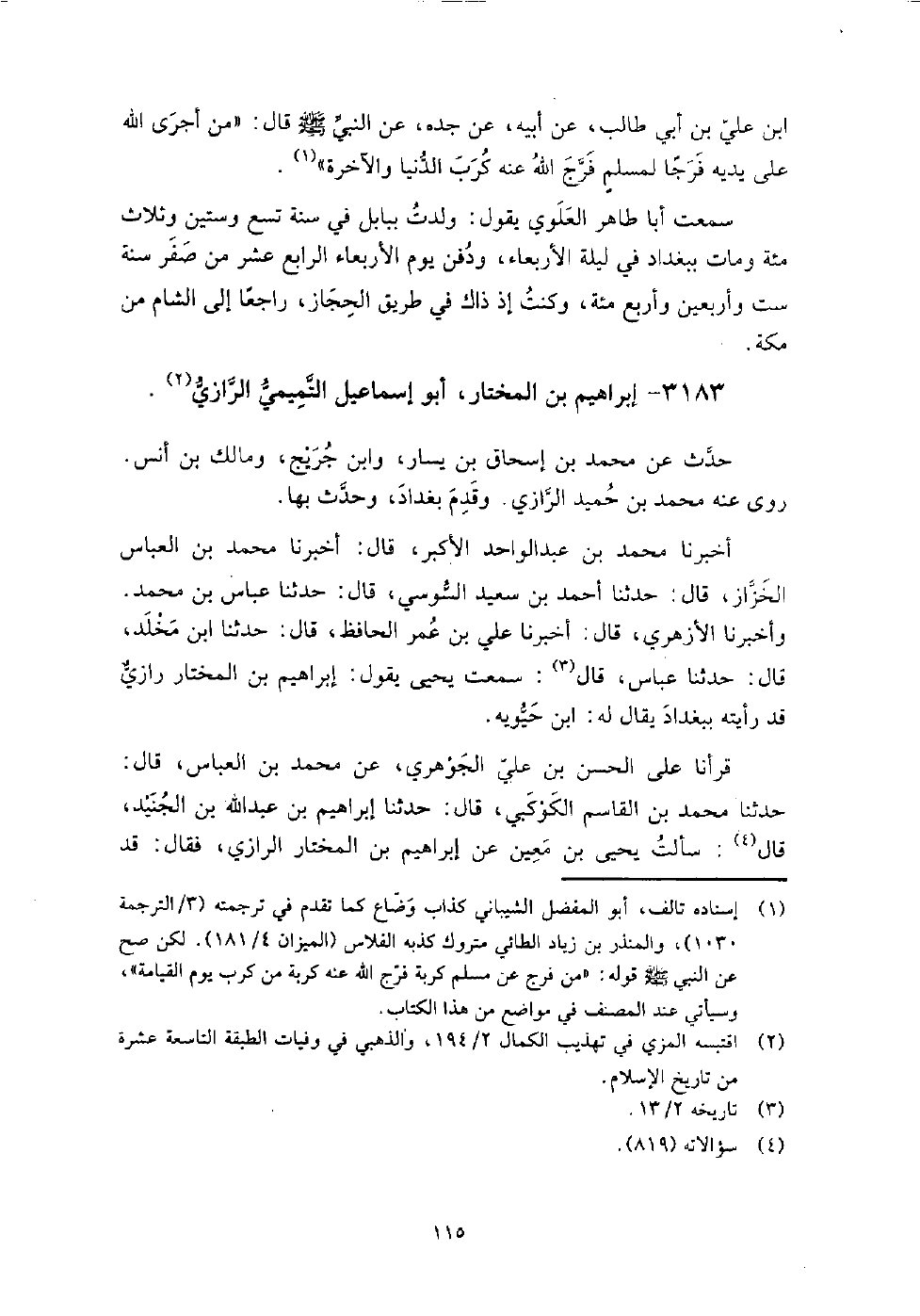 3183 - إبراهيم بن المختار أبو إسماعيل التميمي الرازي حدث عن: محمد بن إسحاق بن يسار، وابن جريج، ومالك بن أنس، روى عنه محمد بن حميد الرازي، وقدم بغداد وحدث بها.