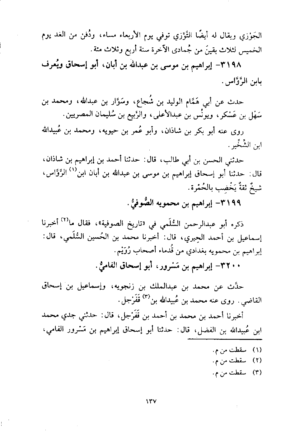 3198 - إبراهيم بن موسى بن عبد الله بن أبان أبو إسحاق ويعرف بابن الرواس حدث عن: أبي همام الوليد بن شجاع، وسوار بن عبد الله، ومحمد بن سهل بن عسكر، ويونس بن عبد الأعلى، والربيع بن سليمان المصريين.