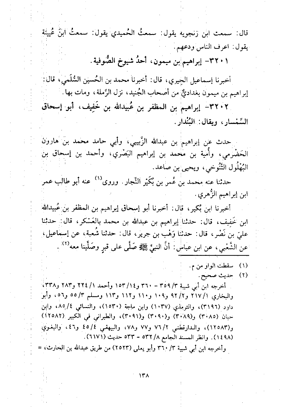 3202 - إبراهيم بن المظفر بن عبيد الله بن خفيف أبو إسحاق السمسار ويقال البندار حدث عن: إبراهيم بن عبد الله الزبيبي، وأبي حامد محمد بن هارون الحضرمي، وأمية بن محمد بن إبراهيم المصري، وأحمد بن إسحاق بن البهلول التنوخي، ويحيى بن صاعد، حدثنا عنه محمد بن عمر بن بكير النجار، روى عنه أبو طالب عمر بن إبراهيم الزهري.