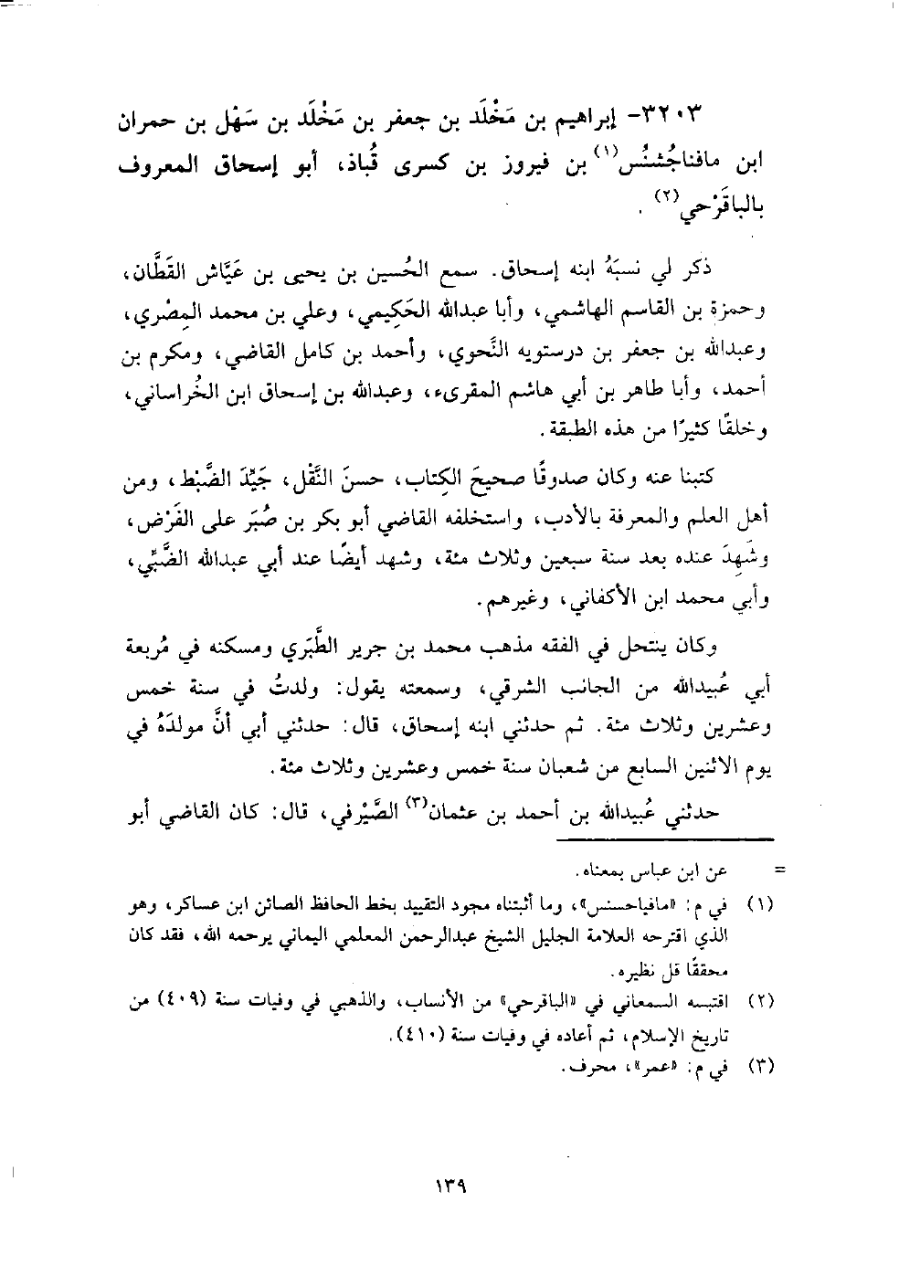 3203 - إبراهيم بن مخلد بن جعفر بن مخلد بن سهل بن حمران بن مافناجُشنُس بن فيروز بن كسرى قُباذ أبو إسحاق المعروف بالباقرحي ذكر لي نسبه ابنه إسحاق، سمع: الحسين بن يحيى بن عياش القطان، وحمزة بن القاسم الهاشمي، وأبا عبد الله الحكيمي، وعلي بن محمد المصري، وعبد الله بن جعفر بن درستويه النحوي، وأحمد بن كامل القاضي، ومكرم بن أحمد، وأبا طاهر بن أبي هاشم المقرئ، وعبد الله بن إسحاق بن الخراساني، وخلقا كثيرا من هذه الطبقة.