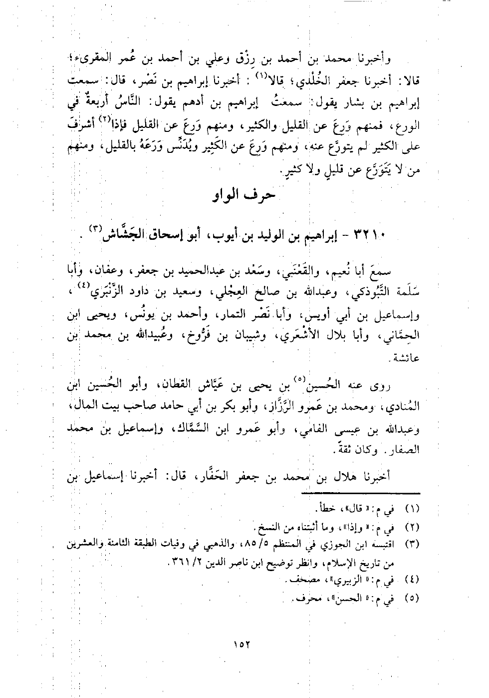 3210 - إبراهيم بن الوليد بن أيوب أبو إسحاق الجشاش سمع: أبا نعيم، والقعنبي، وسعد بن عبد الحميد بن جعفر، وعفان، وأبا سلمة التبوذكي، وعبد الله بن صالح العجلي، وسعيد بن داود الزنبري، وإسماعيل بن أبي أويس، وأبا نصر التمار، وأحمد بن يونس، ويحيى بن الحماني، وأبا بلال الأشعري، وشيبان بن فروخ، وعبيد الله بن محمد ابن عائشة.