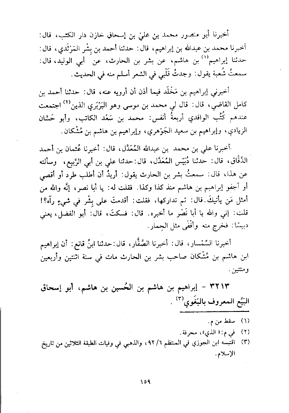 3213 - إبراهيم بن هاشم بن الحسين بن هاشم أبو إسحاق البيع المعروف بالبغوي سمع: أمية بن بسطام، وإبراهيم بن الحجاج السامي، وأبا الربيع الزهراني، وعلي بن الجعد، ومحرز بن عون، ومحمد بن بكار، وأحمد بن حنبل، وأحمد بن سعيد الدارمي.