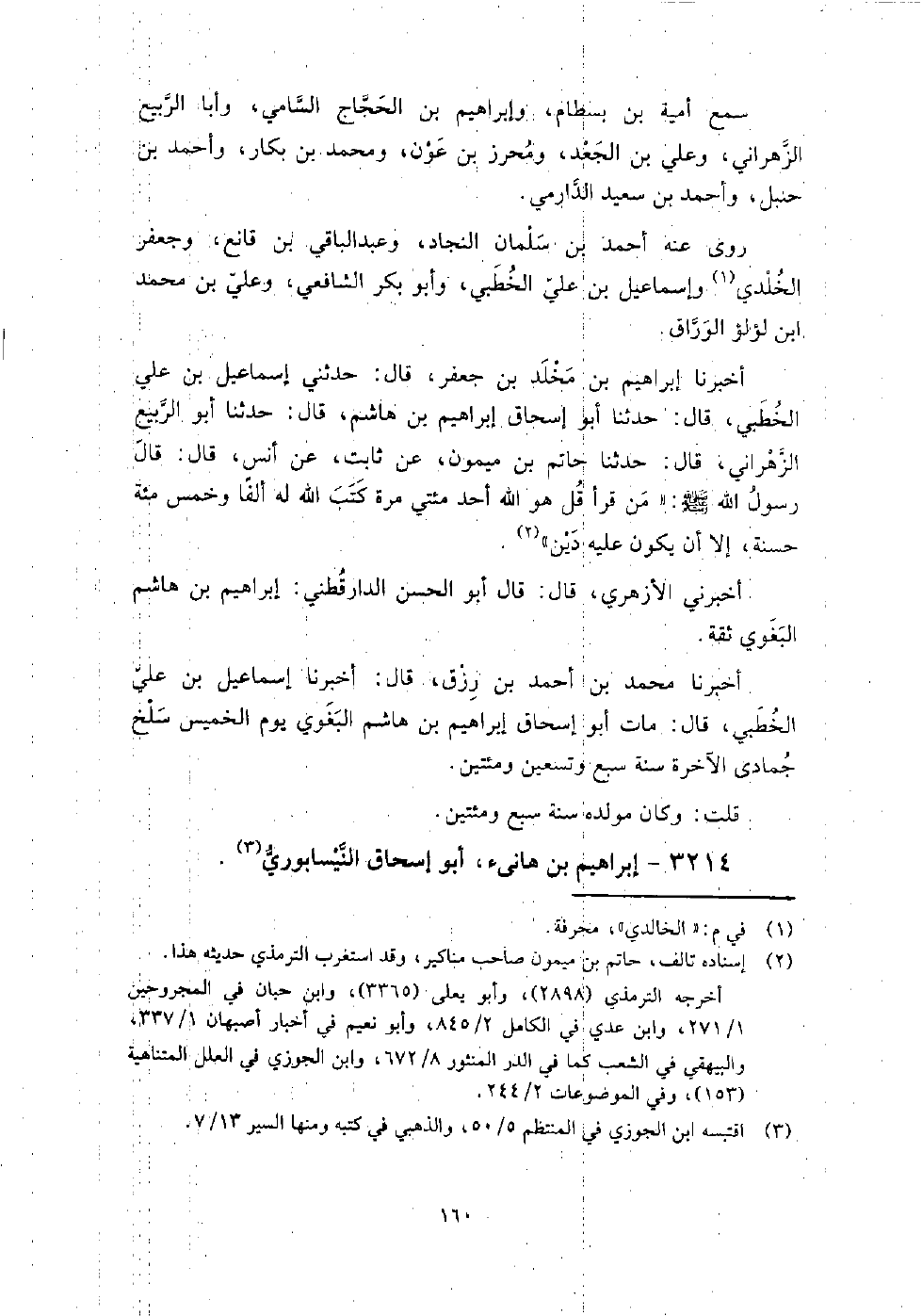 3214 - إبراهيم بن هانئ أبو إسحاق النيسابوري كان أحد الأبدال، ورحل في العلم إلى العراق، والشام، ومصر، ومكة، ثم استوطن بغداد، وحدث بها عن: عبيد الله بن موسى العبسي، ويعلى ومحمد ابني عبيد، وقبيصة بن عقبة، وخلاد بن يحيى، وأبي عبد الرحمن المقرئ، وأبي المغيرة عبد القدوس بن الحجاج، وأبي صالح عبد الله بن صالح المصري، وإبراهيم بن عبد الله بن العلاء بن زبر، وأيوب بن خالد الحراني، وعلي بن عياش، وأبي اليمان، وأمثالهم.