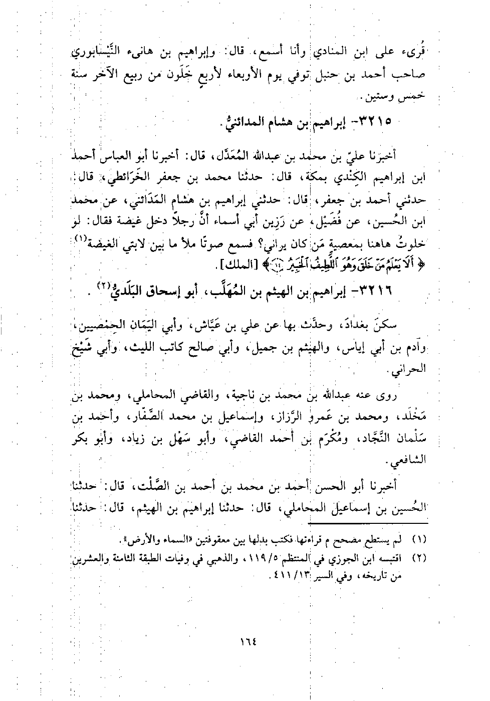 3216 - إبراهيم بن الهيثم بن المهلب أبو إسحاق البلدي سكن بغداد، وحدث بها عن: علي بن عياش، وأبي اليمان الحمصيين، وآدم بن أبي إياس، والهيثم بن جميل، وأبي صالح كاتب الليث، وأبي شيخ الحراني.