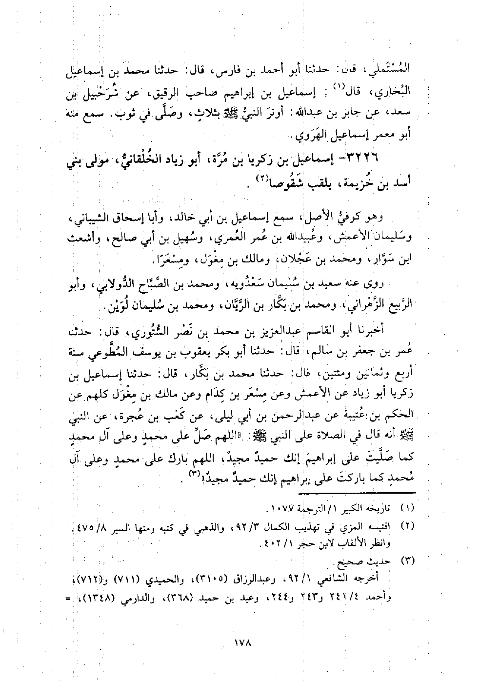 (2066) أَخْبَرَنَا أَبُو الْقَاسِمِ عَبْدُ الْعَزِيزِ بْنُ مُحَمَّدِ بْنِ نَصْرٍ السُّتُورِيُّ، قال: حَدَّثَنَا عُمَرُ بْنُ جَعْفَرِ بْنِ سَالِمٍ، قَالَ: حَدَّثَنَا أَبُو بَكْرٍ يَعْقُوبُ بْنُ يُوسُفَ الْمُطَّوِعِيُّ سَنَةَ أَرْبَعٍ وَثَمَانِينَ وَمِائَتَيْنِ، قَالَ: حَدَّثَنَا مُحَمَّدُ بْنُ بَكَّارٍ، قَالَ: حَدَّثَنَا إِسْمَاعِيلُ بْنُ زَكَرِيَّا أَبُو زِيَادٍ، عَنِ الأَعْمَشِ، وَعَنْ مِسْعَرِ بْنِ كِدَامٍ، وَعَنْ مَالِكِ بْنِ مِغْوَلٍ كُلِّهِمْ، عَنِ الْحَكَمِ بْنِ عُتَيْبَةَ، عَنْ عَبْدِ الرَّحْمَنِ بْنِ أَبِي لَيْلَى، عَنْ كَعْبِ بْنِ عُجْرَةَ، عَنِ النَّبِيِّ صَلَّى اللَّهُ عَلَيْهِ وَسَلَّمَ أَنَّهُ قَالَ فِي الصَّلاةِ عَلَى النَّبِيِّ صَلَّى اللَّهُ عَلَيْهِ وَسَلَّمَ: " اللَّهُمَّ صَلِّ عَلَى مُحَمَّدٍ وَعَلَى آلِ مُحَمَّدٍ كَمَا صَلَّيْتَ عَلَى إِبْرَاهِيمَ إِنَّكَ حَمِيدٌ مَجِيدٌ، اللَّهُمَّ بَارِكْ عَلَى مُحَمَّدٍ وَعَلَى آلِ مُحَمَّدٍ كَمَا بَارَكْتَ عَلَى إِبْرَاهِيمَ إِنَّكَ حَمِيدٌ مَجِيدٌ " أنبأنا علي بن محمد بن عيسى البزاز، قال: حدثنا أبو بكر محمد بن عمر بن سالم القاضي، قال: حدثنا أبو بكر أحمد بن عبيد الشهرزوري، قال: حدثنا محمد بن بكار، قال: سمعنا من قيس بن الربيع، وإسماعيل بن زكريا ببغداد قديما، قال: أخبرنا محمد بن الحسين القطان، قال: أخبرنا علي بن إبراهيم المستملي، قال: حدثنا أبو أحمد بن فارس، قال: حدثنا البخاري، قال: حدثني سليمان أبو الربيع، قال: سمعت عبد الله بن داود، يقول: كان إسماعيل بن زكريا يأتي الأعمش، فيجلس بجنبه، ونحن ناحية.