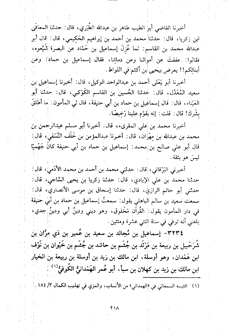 3234 - إسماعيل بن مجالد بن سعيد بن عمير بن ذي مران بن شرحبيل بن ربيعة بن مرثد بن جشم بن حاشد بن جشم بن خيوان بن نوف بن همدان وهو أوسلة بن مالك بن زيد بن أوسلة بن ربيعة بن الخيار بن مالك بن زيد بن كهلان بن سبأ أبو عمر الهمداني الكوفي