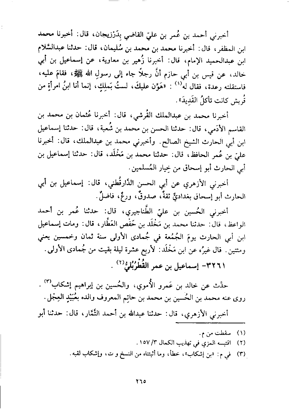 3261 - إسماعيل بن عمر القطربلي حدث عن: خالد بن عمرو الأموي، والحسين بن إبراهيم إشكاب، روى عنه محمد بن الحسين بن محمد بن حاتم، المعروف والده بعبيد العجل.