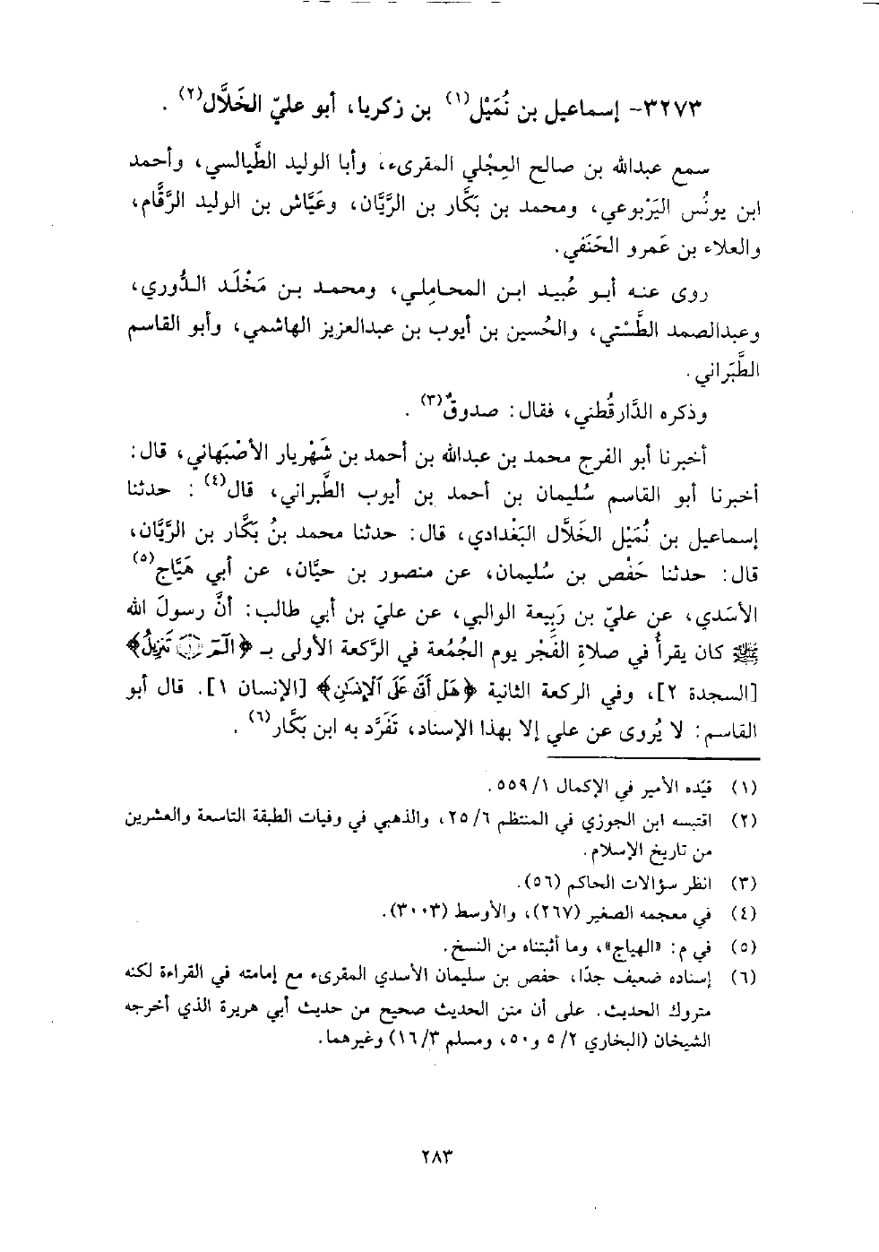 3273 - إسماعيل بن نميل بن زكريا أبو علي الخلال سمع: عبد الله بن صالح العجلي المقرئ، وأبا الوليد الطيالسي، وأحمد بن يونس اليربوعي، ومحمد بن بكار بن الريان، وعياش بن الوليد الرقام، والعلاء بن عمرو الحنفي.