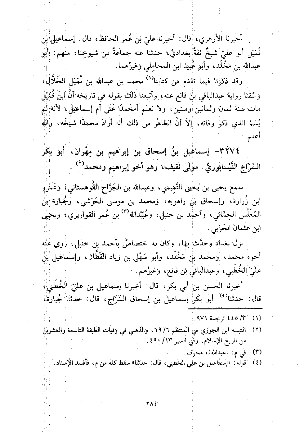 3274 - إسماعيل بن إسحاق بن إبراهيم بن مهران أبو بكر السراج النيسابوري مولى ثقيف وهو أخو إبراهيم ومحمد سمع: يحيى بن يحيى التميمي، وعبد الله بن الجراح القوهستاني، وعمرو بن زرارة، وإسحاق بن راهويه، ومحمد بن موسى الحرشي، وجبارة بن المغلس الحماني، وأحمد بن حنبل، وعبيد الله بن عمر القواريري، ويحيى بن عثمان الحربي، نزل بغداد وحدث بها، وكان له اختصاص بأحمد بن حنبل.