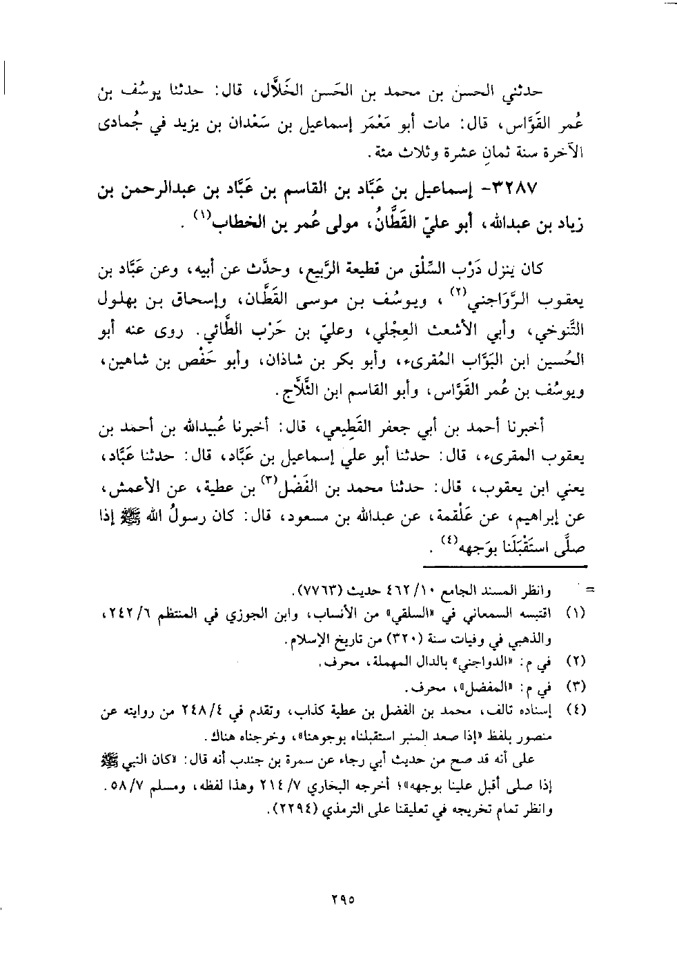 3287 - إسماعيل بن عباد بن القاسم بن عباد بن عبد الرحمن بن زياد بن عبد الله أبو علي القطان مولى عمر بن الخطاب
