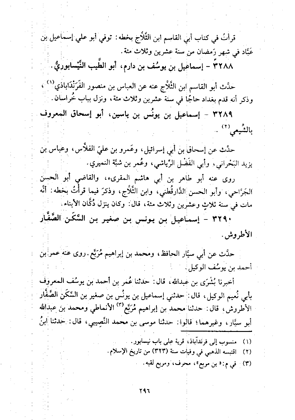 3289 - إسماعيل بن يونس بن ياسين أبو إسحاق المعروف بالشيعي حدث عن: إسحاق بن أبي إسرائيل، وعمرو بن علي الفلاس، وعباس بن يزيد البحراني، وأبي الفضل الرياشي، وعمر بن شبة النميري.